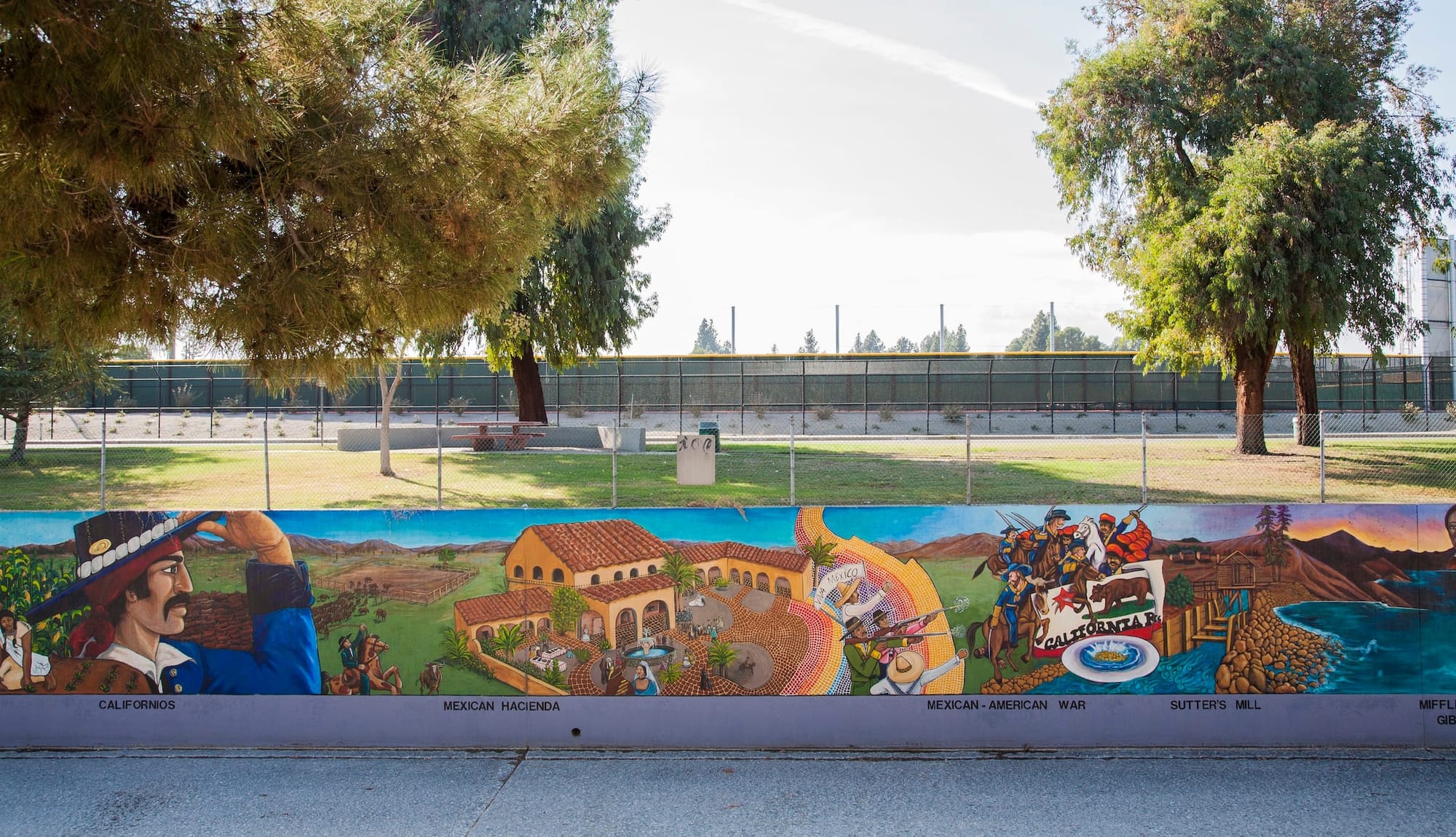Baca began work on the mural in 1974 as a monument to California’s long multi-ethnic and queer history along the concrete walls lining the San Fernando Valley's Tujunga Wash flood control channel. The project was completed over several summers with the help of over 400 young people from the local community and their families. She founded SPARC in 1976 as a public arts nonprofit. From 1983 until a 2011 restoration project, she and the organization jointly held the mural's copyright. Now, Baca retains the rights to the work.