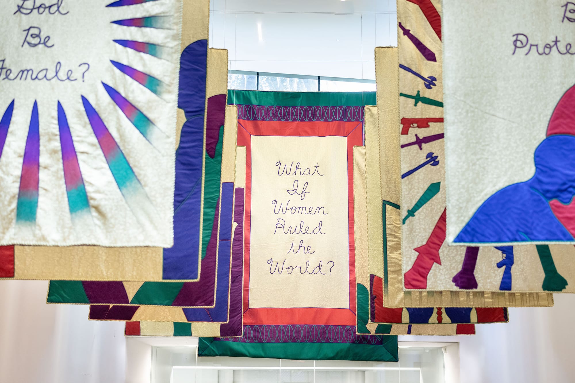 But the more I thought about it, the pieces from “The Female Divine” provided a more fitting close to the exhibit than her early experiments with minimalism. They echo the utopian impulses of her most explicitly feminist work and bring us full circle back to the present. The banners speculate on what life might be like if women were in charge — Would God be female? Would men and women be equal? Would there be equal parenting? Would the earth be protected? — and they invite us to imagine a future that is better than the hyper-polarized, pandemic-ravaged world we live in today. With everything we’ve been through, it’s undeniably appealing to dream of being reborn into a society that’s less divided, less hostile to women, and more just for everyone. To me, Chicago is at her most powerful not when she shows us “what is,” but when she asks us, “what could be?”