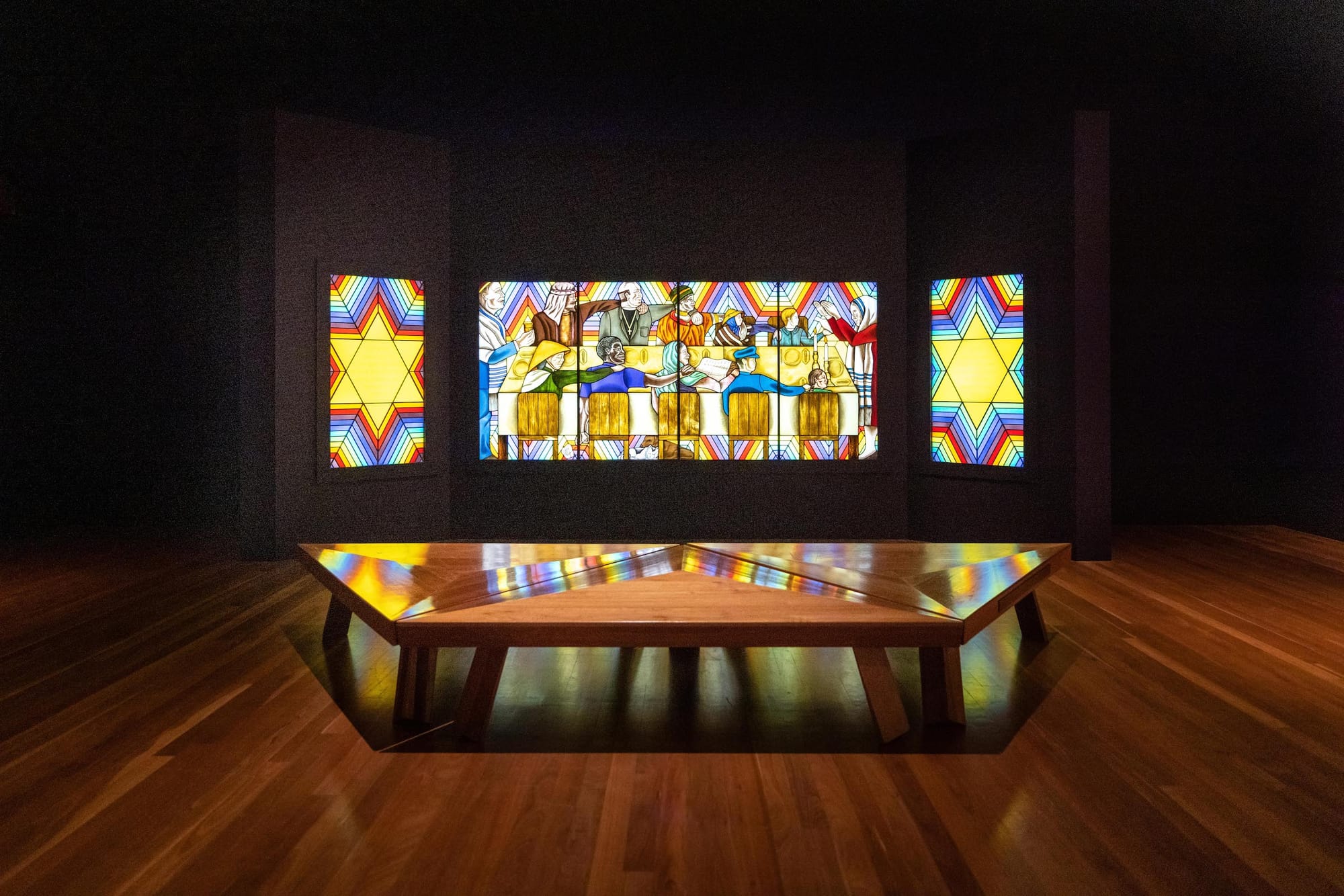 Holocaust Project: From Darkness into Light (1985-1993) is a series of mostly paintings and sculptures and a tapestry mural representing the artist’s examination of her Jewish heritage and the atrocities of the Holocaust. This body of work culminates in a darkened room with black walls where a magnificent stained-glass piece, “Rainbow Shabbat” (1992), literally lights up the space with a vision of a more equitable world represented by diverse individuals seated together, heads turned towards a standing Mother Teresa-like figure at the head of the table.