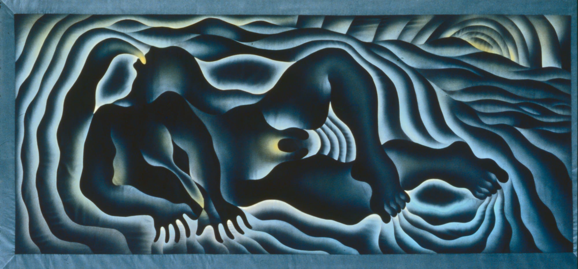Judy Chicago, "Earth Birth", from the series "Birth Project" (1983), sprayed Versatex and DMC floss on fabric, 60 3/4 x 132 1/4 inches, quilting by Jacquelyn Moore Alexander (collection of Jeanne Greenberg Rohatyn and Nicolas Rohatyn, © Judy Chicago / Artists Rights Society (ARS), New York, photo © Donald Woodman / ARS, NY, image courtesy the Fine Arts Museums of San Francisco)