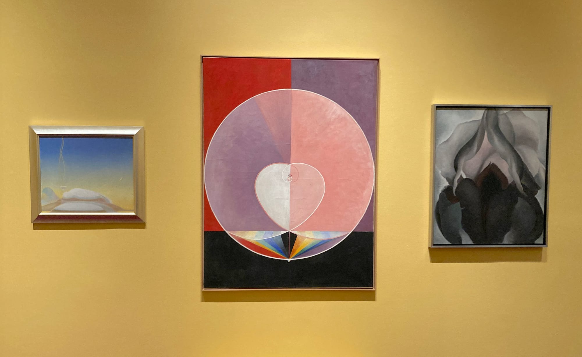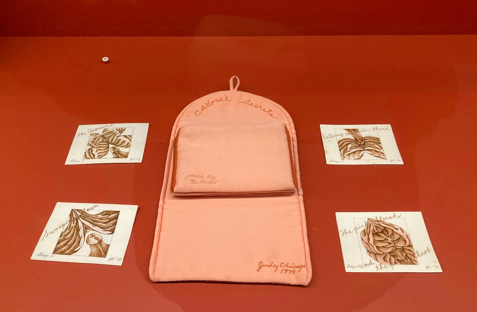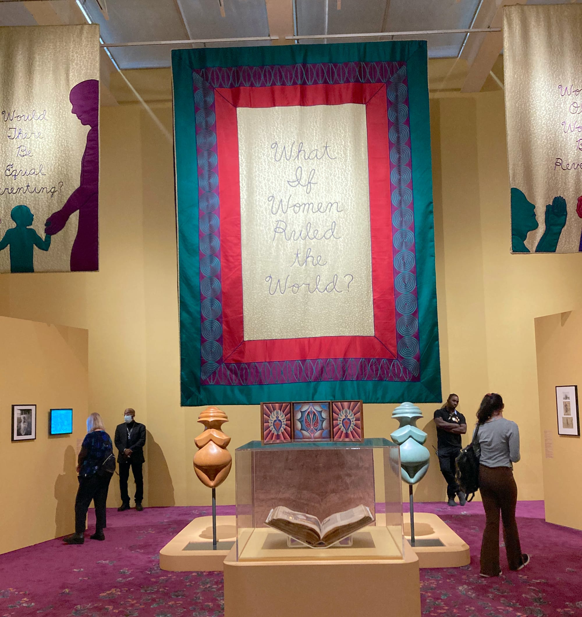 The City of Ladies, an installation of work by other artists forming a “personal museum” of Chicago’s influences, is a particularly messy example of this contradiction. It features stunning artwork by Frida Kahlo, Hilma af Klint, Georgia O’Keeffe, Dora Maar, Leonora Carrington, Käthe Kollwitz, Artemesia Gentileschi, and others. The context implies that these artists hold the prominence they do purely because of their importance to Chicago, that without her championing they would be obscure. In "The Dinner Party," historical figures are framed through Chicago’s tributes to them; here, represented by their own works, it seems less like homage and more like possession. Though the wall text specifies that these are “women and genderqueer artists,” it’s insensitive and disrespectful to see Claude Cahun, Toyen, and Gluck — three artists who changed their names and gender presentations well before Chicago put on her boxing gloves — under the umbrella of “Ladies.” There’s also little that links the works in this space apart from the gendering of their makers: What does Hildegard von Bingen, a 12th-century Benedictine nun and composer, have to say to Zora Neale Hurston? Hanging over The City of Ladies is the Feminine Divine, a series of banners made by Chicago for a Dior catwalk show in 2020, asking “What if Women Ruled the World?” (Dior is also a sponsor of the show.) Beneath these hangings, embroidered with simplistic and cutesy hypotheticals like “Would Buildings Resemble Wombs?” the potential impact of seeing such remarkable works by so many incredible artists gathered together becomes a hacky, girl-power punchline.