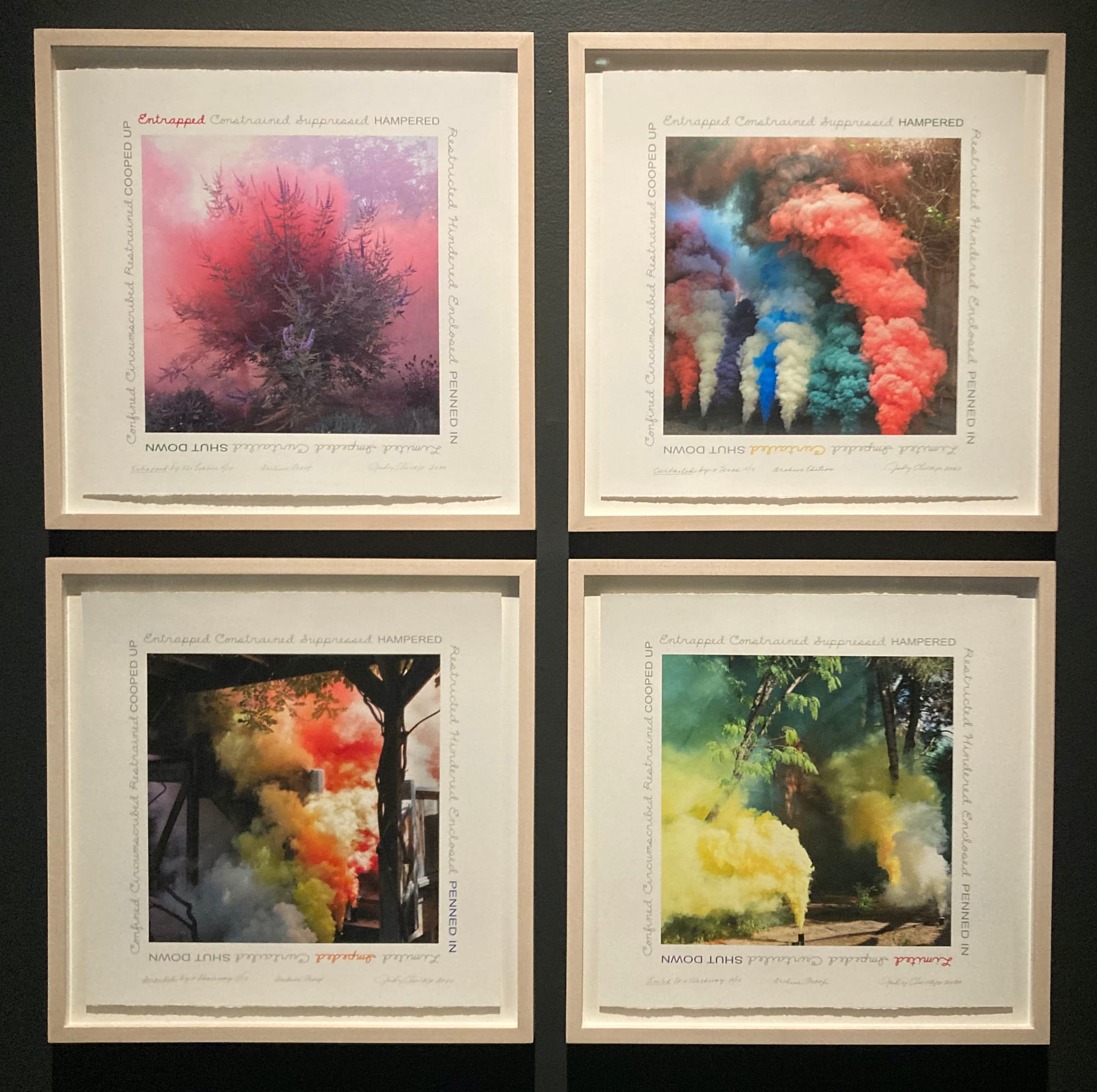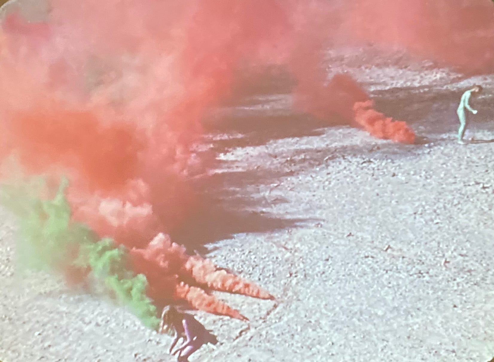 At times, Herstory struggles to decide if it is chronological or thematic — photographs and films from the Atmospheres performance series (begun 1968) are juxtaposed with four images from Garden Smoke, a project from 2020 using single-colored flares. It can be interesting to see an artist return to an earlier theme or technique, but these works, made around Chicago’s home during COVID-19 lockdowns, lack the beauty and dreaminess of the Atmospheres’ desert locations. The text around the images, reading “entrapped,” “constrained,” “cooped up,” and “shut down,” is clunkily literal, and makes Garden Smoke come across like a grouchy journaling exercise.