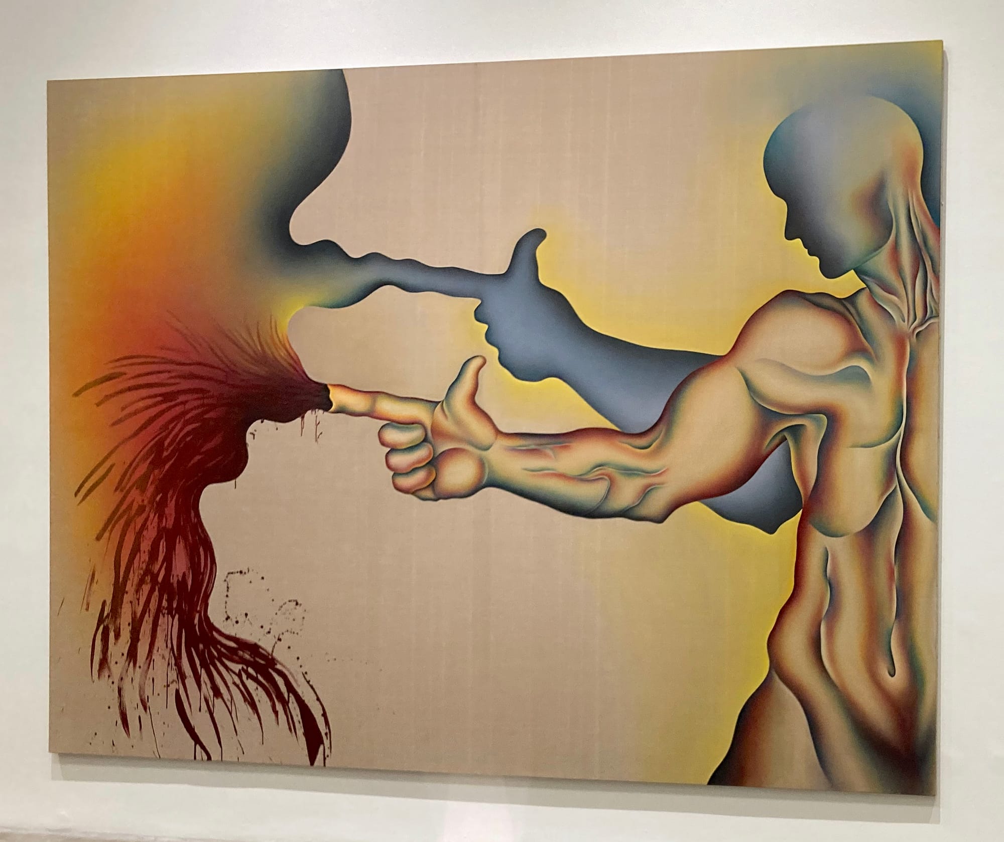 Chicago’s work from the 1980s on — post "The Dinner Party" — lacks teeth. Womanhouse, produced in collaboration with other artists from the CalArts Feminist Art Program in 1972, including Faith Wilding, Miriam Schapiro, and Mira Schor, still feels compelling, in part because of the ironic humor and camp in the face of misogyny that ran through the installation. There’s a sense of fun to the installations and performances, represented here through photographs, that is absent from the rest of the exhibition. Chicago’s humorlessness is most obvious on the third floor: the massive Powerplay paintings, with titles like “Pissing on Nature” and “In the Shadow of the Handgun," are excruciatingly on the nose. With “Resolutions: A Stitch in Time” she attempted a “contemporary take” on aphorisms and proverbs (e.g., "we're all in the same boat," "home sweet home"), resulting in works that are more therapist’s waiting room than the intended "social activism.”