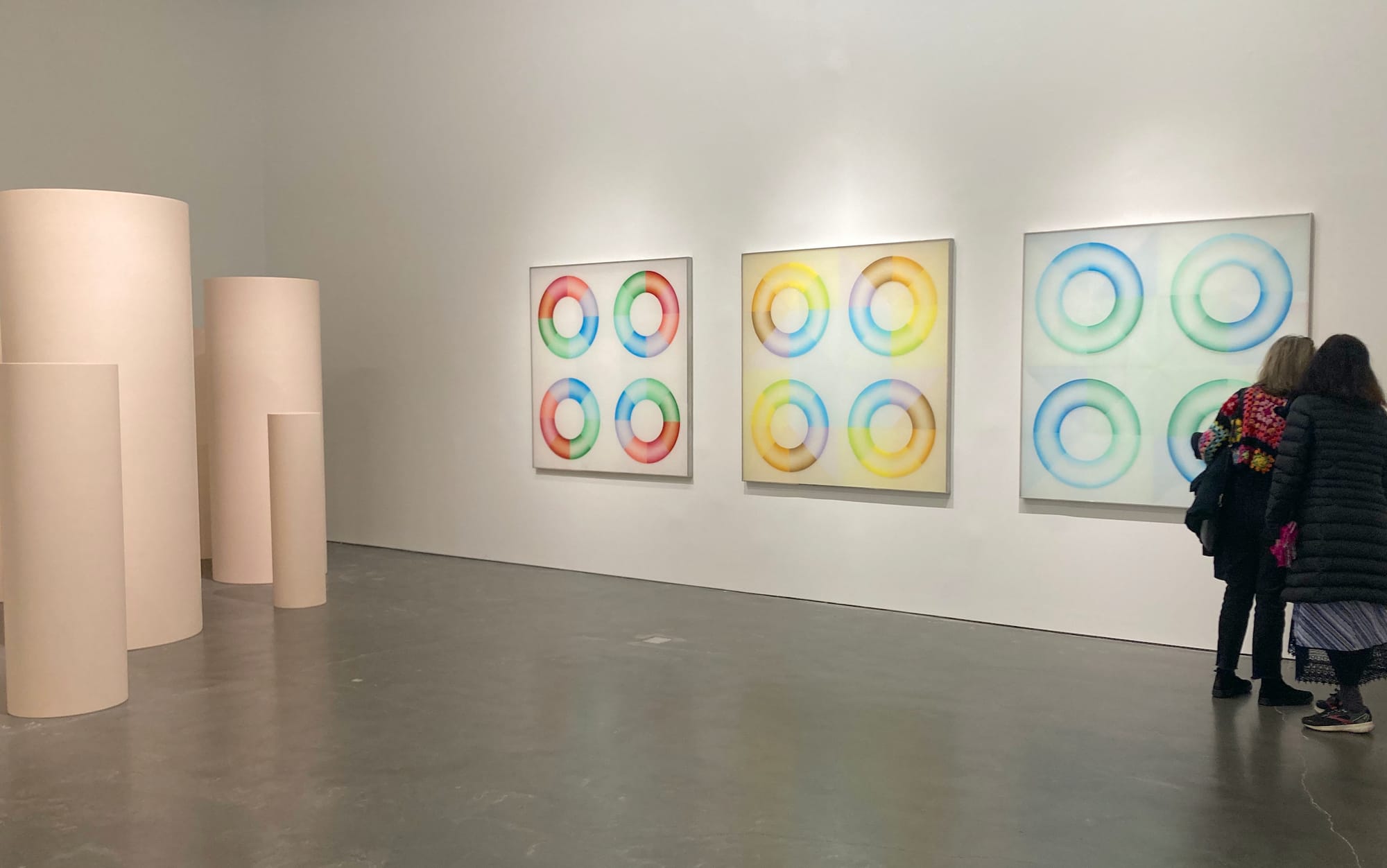 Chicago’s most famous work isn’t here. "The Dinner Party" (1974–79), which doesn’t travel, remains at the Brooklyn Museum. It’s not hard to make a day of it and see the installation there and Herstory, but its absence is felt here. The show begins on the second floor with three colorful geometric paintings on car hoods from the 1960s, and two pleasingly glossy sculptures, “Trinity” and “Rainbow Pickett” (both from 1965). Hints of the floral-vulvic shapes that Chicago is most known for appear in these works, and together with the late 1960s–early '70s Fresno Fan and Pasadena Lifesavers series in the next room, they ground her among her contemporaries in minimalism. These works are clean and slick, but feel somewhat insubstantial, unremarkable below the surface. Chicago sought to capture the “dissolving sensation” of orgasm in the immaculate rings of Pasadena Lifesavers, but it doesn’t feel successful: apart from the very literal O, these feel too tidy, not sensual at all.