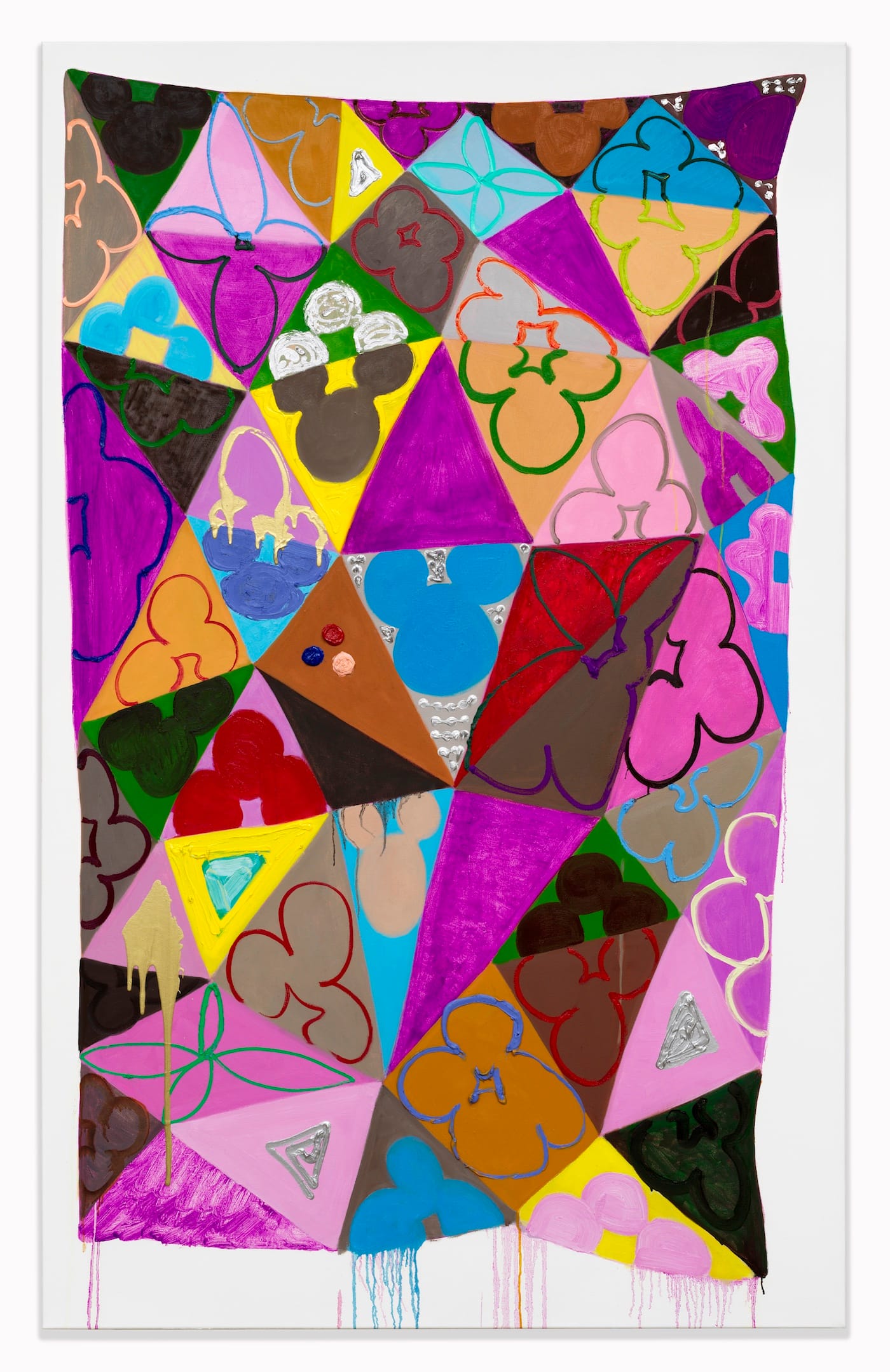 Ledgerwood’s vocabulary includes hand-painted quatrefoils, interlocking triangles, diamond-patterned grids, thickly painted labial shapes, and metallic paint. Compositionally, she often employs irregular rectangles — a surrogate for a piece of embroidered cloth or quilt — painted on an immaculate white ground, with a wide border between the rectangle’s pliable and uneven edges and canvas’s rigid physical borders. Rivulets of watery paint drip down from the painted rectangle’s bottom edge. Many of her circular forms are discs made of thick paint. Her paintings evoke fecundity and ripeness — they literally and figuratively brim over.