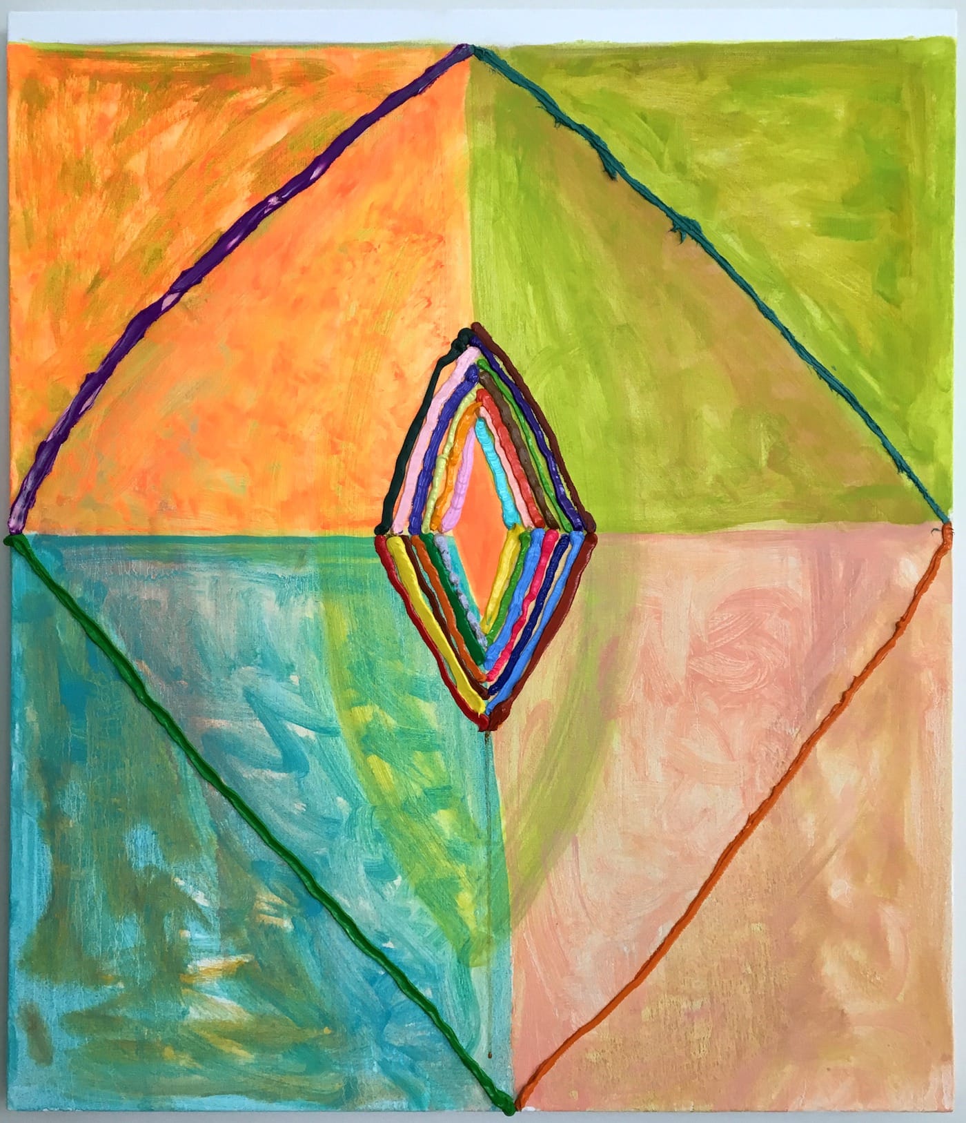 In “Sheela,” Ledgerwood draws the diamond’s thick line over a ground that has been divided into four rectangles. Each line of the diamond is a different color (purple, two variations of dark green, and reddish brown), while each rectangle is defined by washes of color adding up to an overall, spring-like atmosphere: orange, grass green, turquoise green, and rose madder. It is likely that Ledgerwood knows that the colors can be read symbolically, since green jade green is considered to be healing stone, and rose quartz opens the heart.