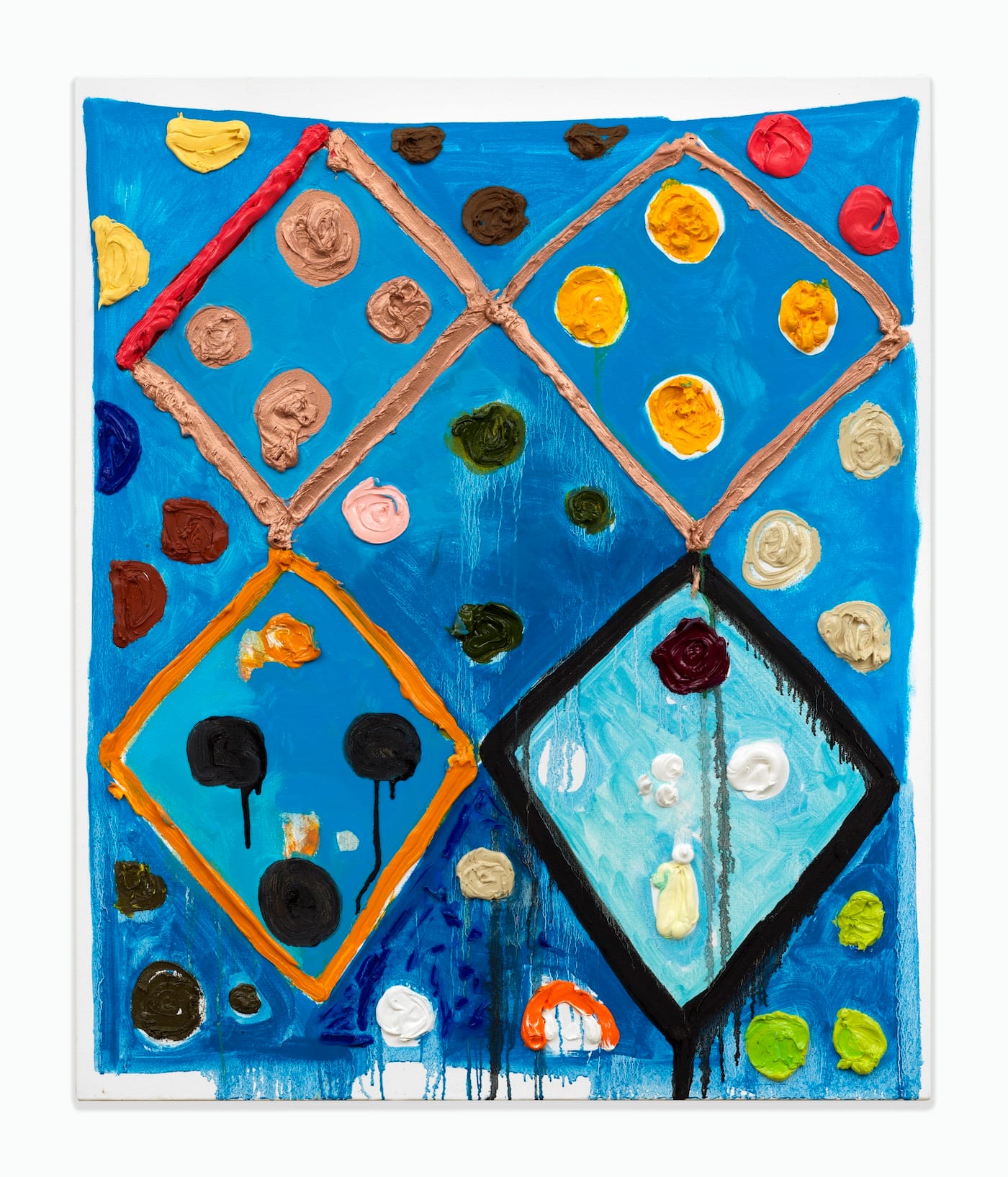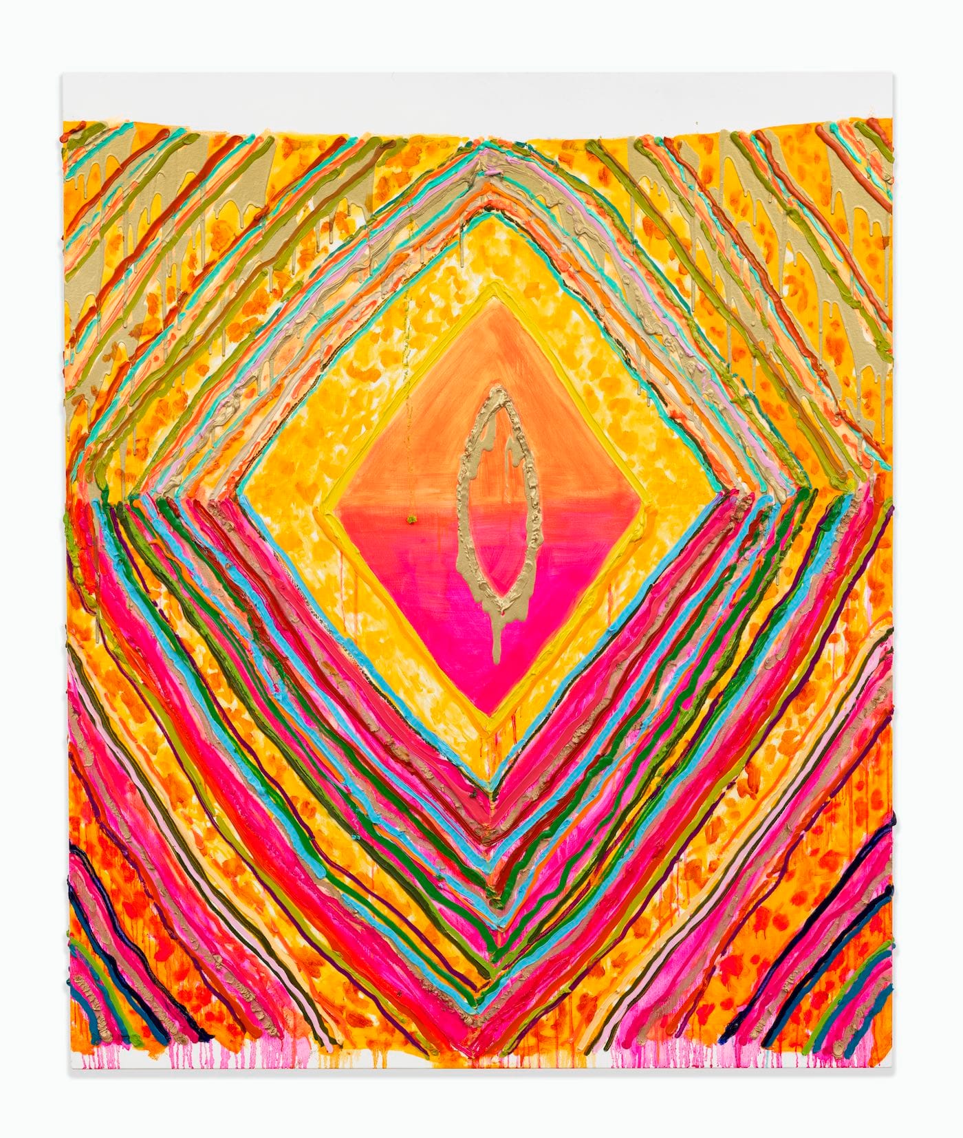 Ledgerwood’s works are both painted surfaces and things. She has overlaid the ground with a diamond of thickly painted, concentric lines that ripple out to the painting’s edges from a central, open diamond. Inside the open diamond, whose ground is horizontally divided between fuchsia below and orange above, the artist has drawn a double-pointed oval in metallic gold paint. The surface of the oval is crusty and dripping. Meanwhile, the concentric lines are done in yellows, magentas, fuchsias, reds, pinks, and turquoise blues. Often, the concentric lines are painted in clusters of two or three ridges of color. In the yellow ground between these clusters, Ledgerwood paints orange, fuchsia, and dark yellow daubs, as well as dripping splashes of metallic gold. Rivulets of pink and yellow are dripping down from the rectangle of paint.
