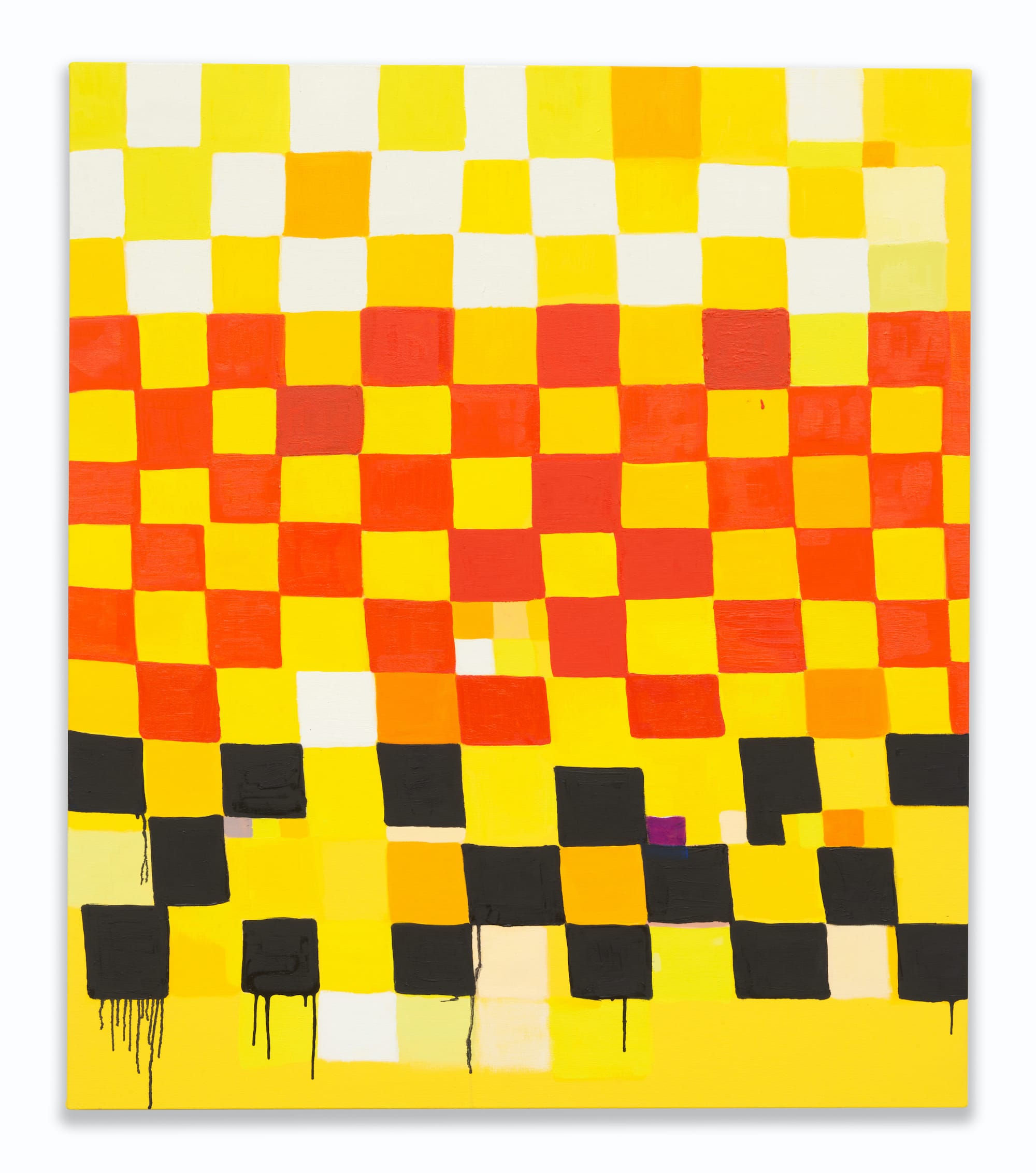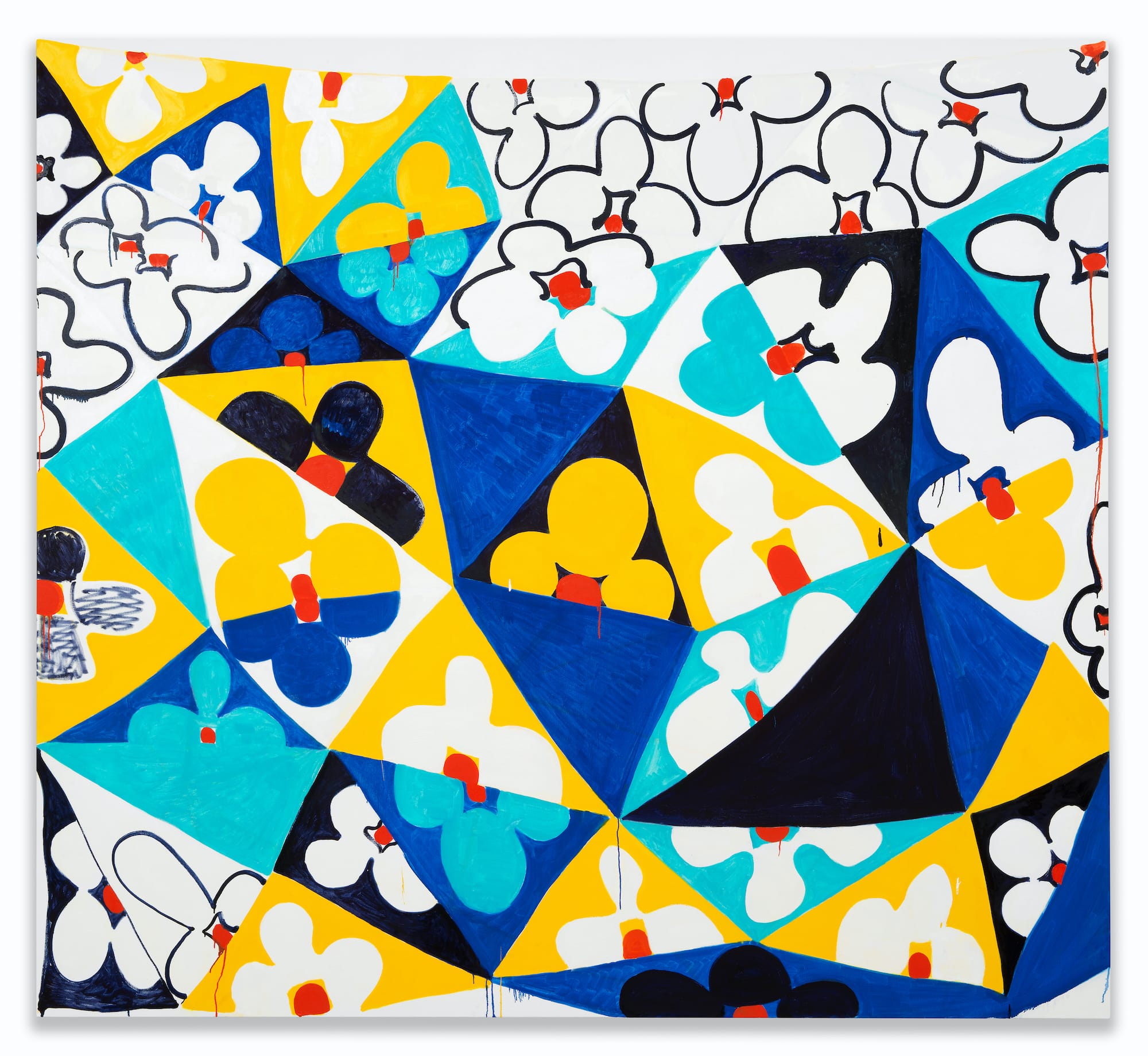 "Jaywalking” (2022), the largest painting in her debut exhibition, Judy Ledgerwood: Sunny, at Denny Gallery (January 7–February 11, 2023), exemplifies how far the artist will go to undo P&D’s conventions of structure and repetition without abandoning them altogether. Starting on the left side of the sagging top edge, Ledgerwood has painted irregular yellow, turquoise, blue, and black triangles in varying sizes, along with a few rectangles that fit together. The monochromatic triangles, which contain incomplete and complete quatrefoils, descend down the surface, with a few drips of color here and there.