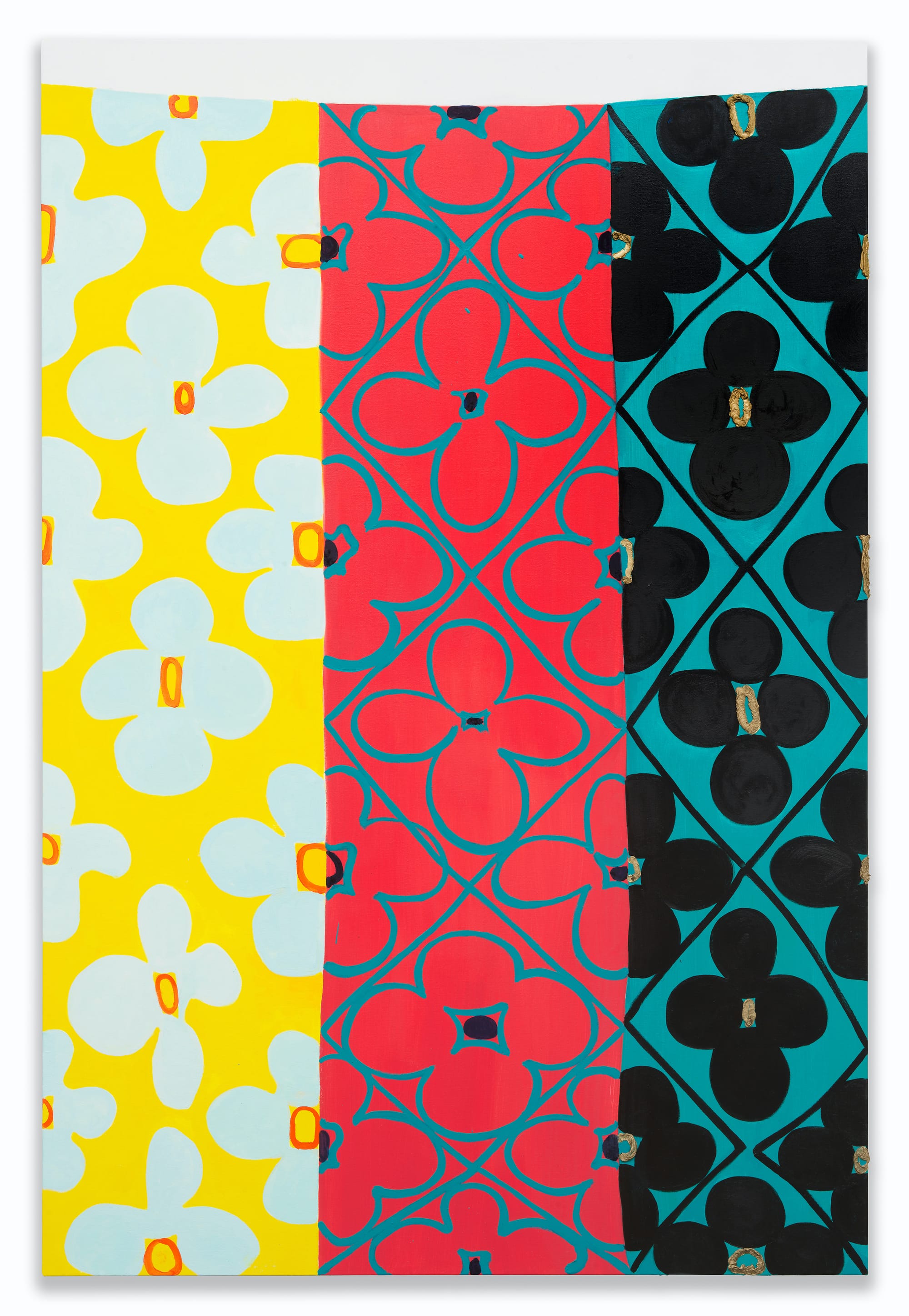 In “Footsteps” (2022), Ledgerwood divides the painting into three vertical bands, in yellow, red, and turquoise. In the yellow area is a staggered arrangement of white quatrefoils, while in the red band are quatrefoils within turquoise diamonds. And in the turquoise band are black quatrefoils within black diamonds. The suggestive metallic outline of a thick vertical almond is added to the shapes in this band. The balance between symmetry and repetition is always off-kilter and tweaked, largely because Ledgerwood paints directly onto the canvas without going back into the work.