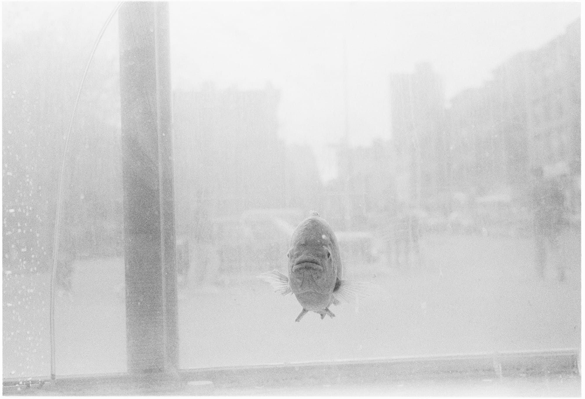 Linn’s “fish east broadway” is emblematic of her street photographs, which she has been taking since the late 1960s — a museum survey is long overdue. Standing outside a restaurant in New York City’s Chinatown, she photographs a single carp in the fish tank. The photograph is composed of washed-out grays. The most salient presence is the carp looking at the viewer. On the right, we can see someone walking away. Between the person and the fish are the faint legs of people standing together. No matter much we look into the photograph, everything seems on the brink of being erased by the light. I think of the image as a self-portrait of Linn as a flaneuse.