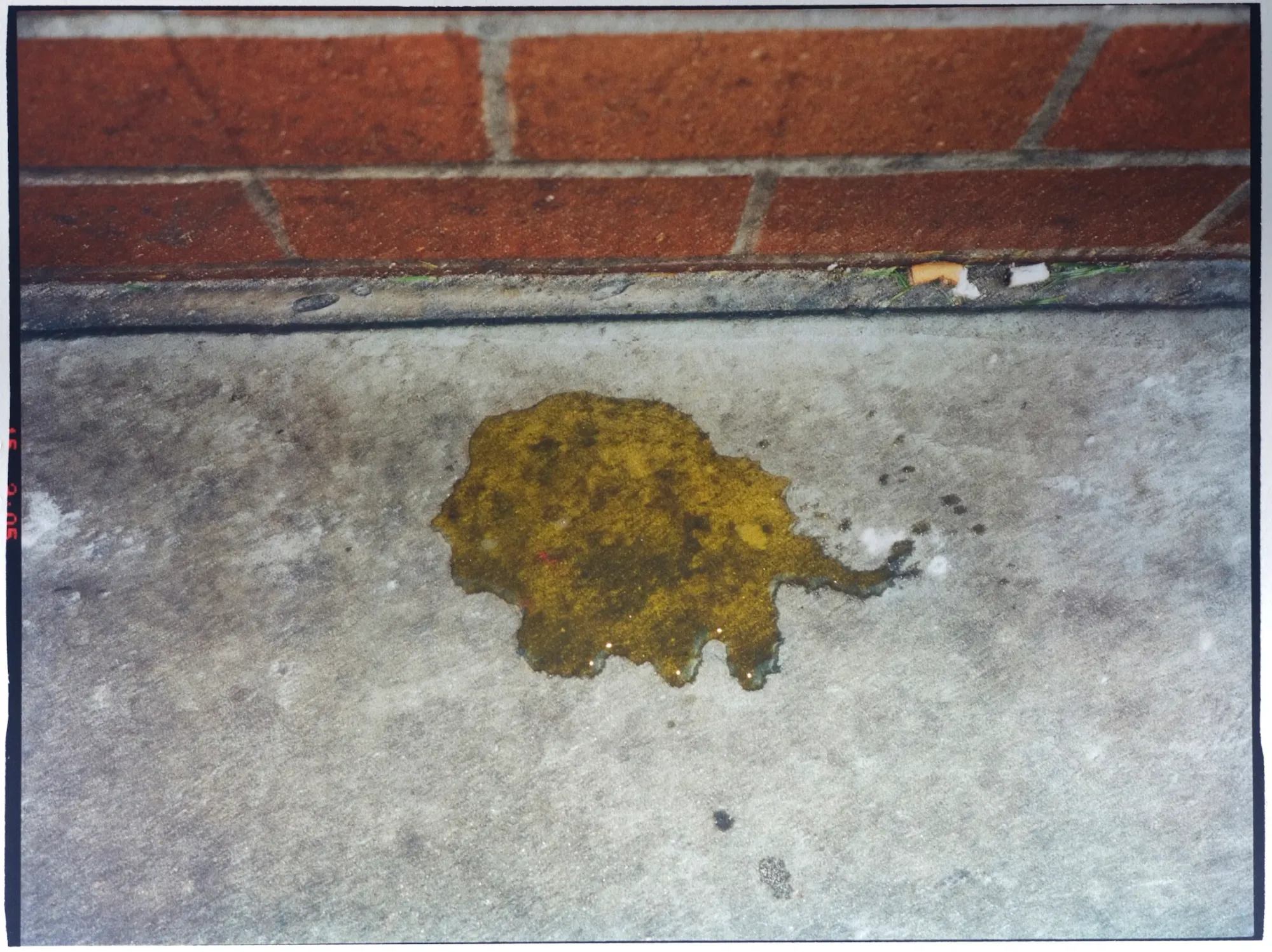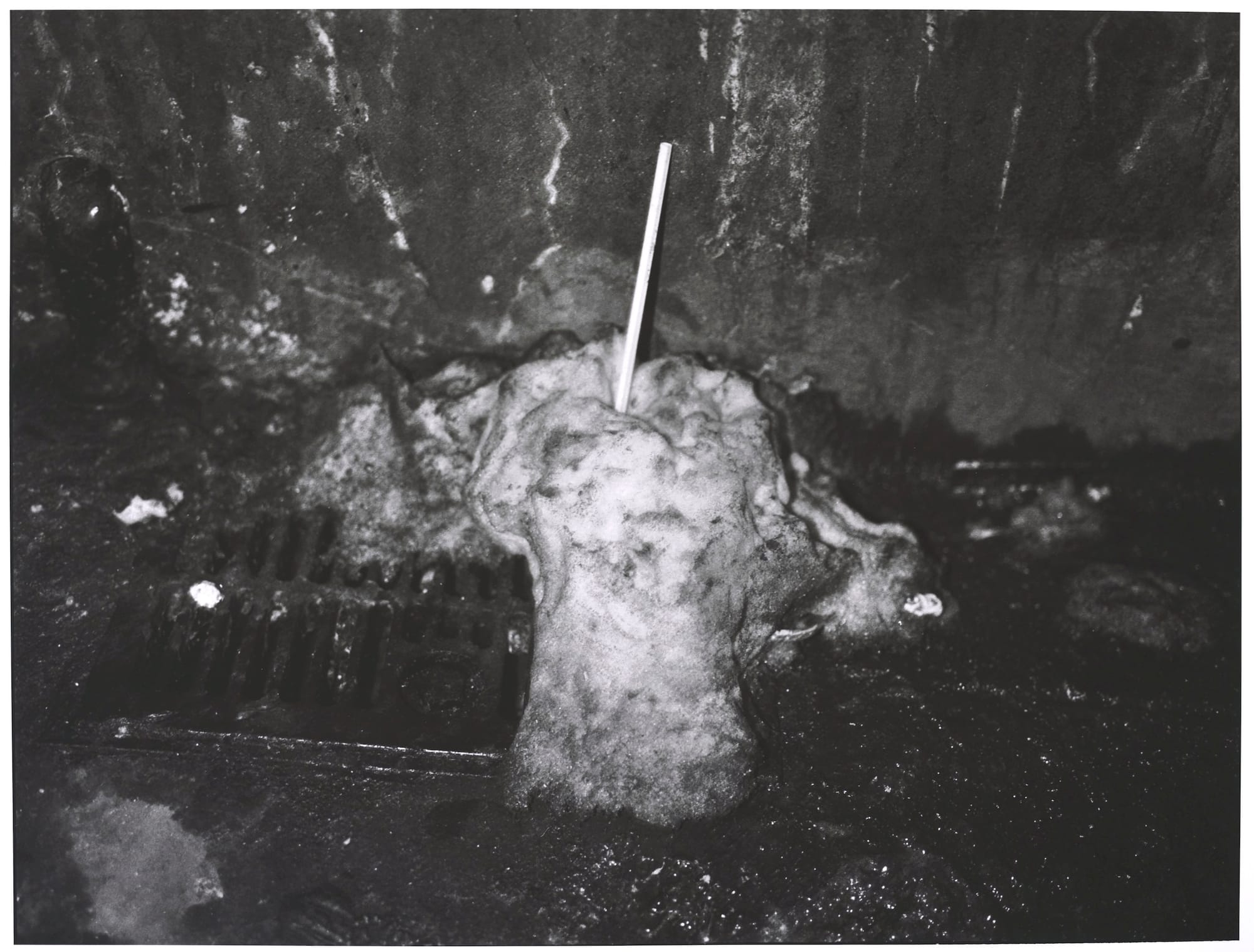 Before my visit, I had my favorites, such as “tilted house” (2002), “fish east broadway” (1995), and “dendur” (2001), but when I saw the color photograph “frozen piss,” something clicked. On a gray stretch of pavement in front of a brick wall, a discolored puddle of piss has frozen into the shape of an elephant. This image of an unappealing subject was a reminder of how banal, dirty, and weirdly beautiful living in New York can be. Yet it was the shape that made me look longer.