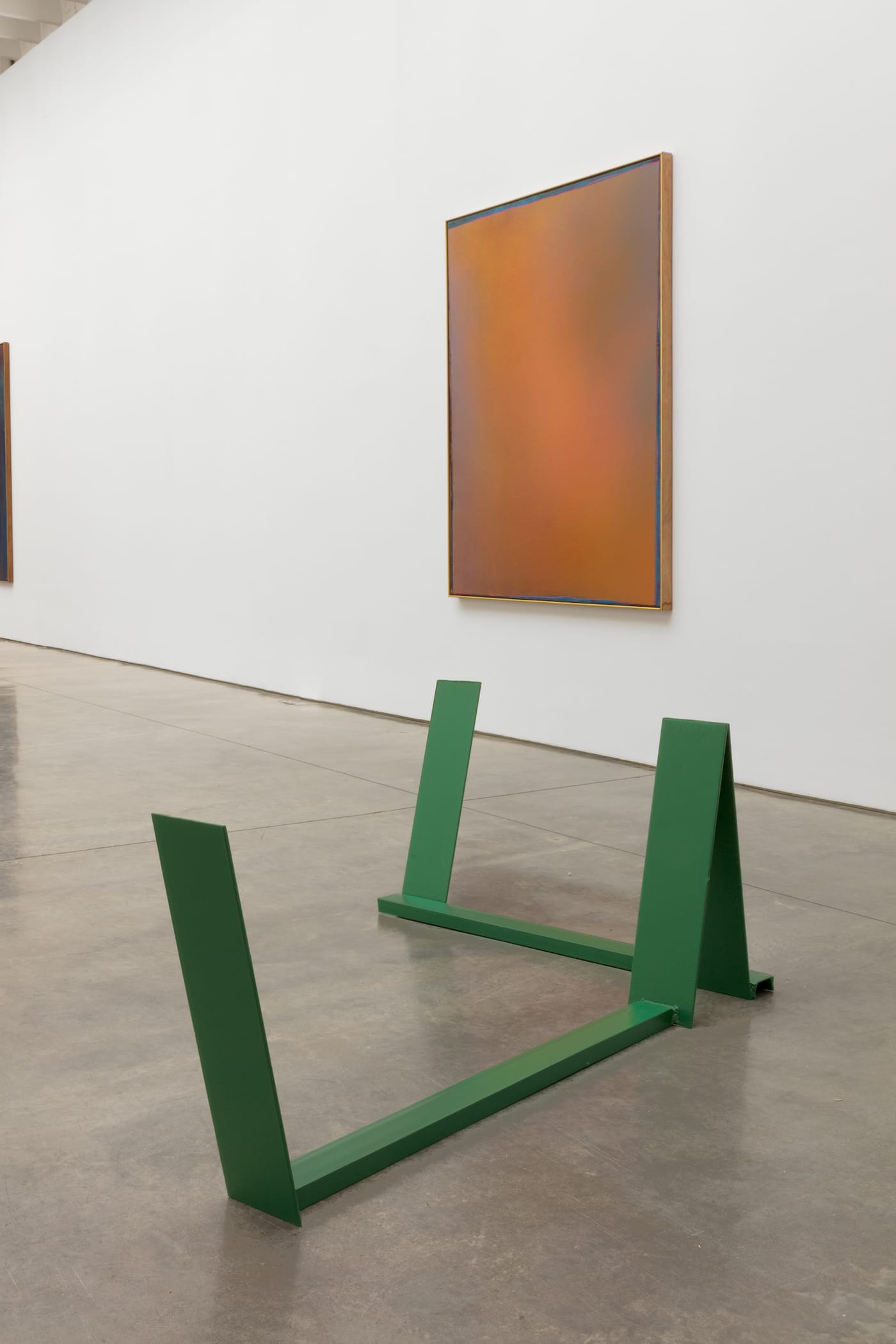 The paintings and sculptures in Caro & Olitski: 1965–1968 require viewers to concentrate their attention over time, as they do when listening to music, in order to discover what these works have to offer. Olitski’s paintings, such as the exhibition’s generous, seductive “Tut Pink” (1965), or the more reticent, more intimate, but no less rich “Purple Love” (1968), literally cannot be seen immediately. It takes prolonged looking for our eyes to adjust, so that the unstable shifts in color become visible. The radiant hues in Olitski’s spray paintings turn out not to be monochromes but, rather, delicately modulated expanses that often change dramatically across the surface of the canvas. Dull blues coalesce out of zones of intense pink and then subside again. It’s as if Olitski were testing how much he could eliminate from a picture and still have something compelling, complex, and eloquent to look at.
