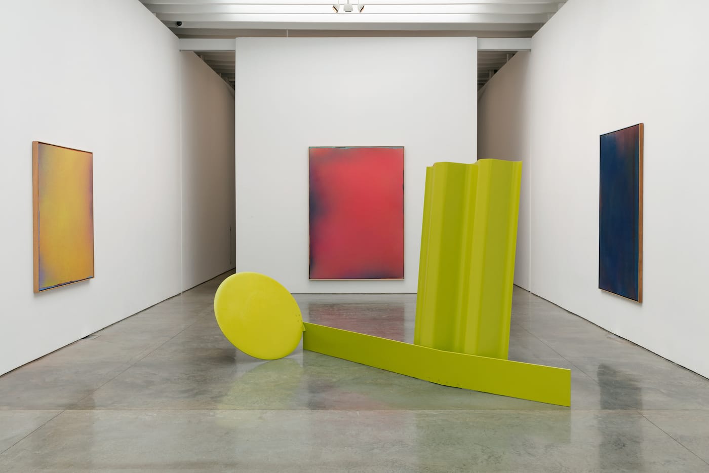 Each of the three works posits a different idea about what sculpture can be. “Green Sleeper” (1965), claims a chunk of space by measuring it against the floor plane, then loosely implies upward extension with casually angled verticals. The whole should suggest a schematic enclosure, but instead keeps us at bay, engaging us with the different relationships between each slanted vertical and the long horizontals. “Prima Luce” (1966) seems more visually solid at first, but its acid yellow-green color helps to disembody its distinct parts: a pleated, vertical “screen” and a large, low-lying disc, which lightly embraces a ground-skimming horizontal. Again, the sculpture pushes us away, encouraging us to see it as a whole. As is typical of Caro’s work, it makes us experience its hovering extension and the space between its verticals in terms of our own physicality, which animates the literally weighty piece. The golden ochre “Trefoil” (1968) is the most athletic of the three Caros, with its poised central plane, levitating above fluently “drawn” arcs, punctuated by emphatic vertical bars. It’s impossible to think of the arcs or bars as supports. “Trefoil” seems as airborne and for the eye alone as any of Olitski’s clouds of color, at the same time that it seems to be entirely about three-dimensionality and articulation in space.