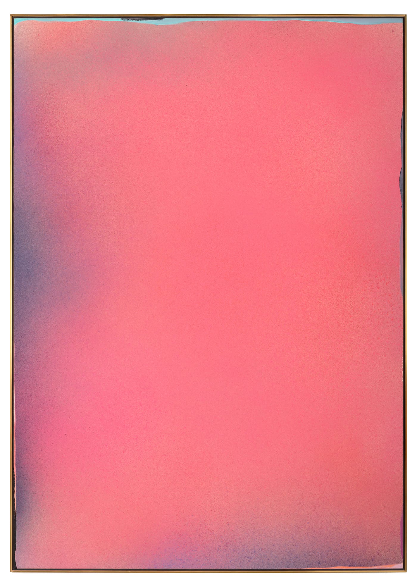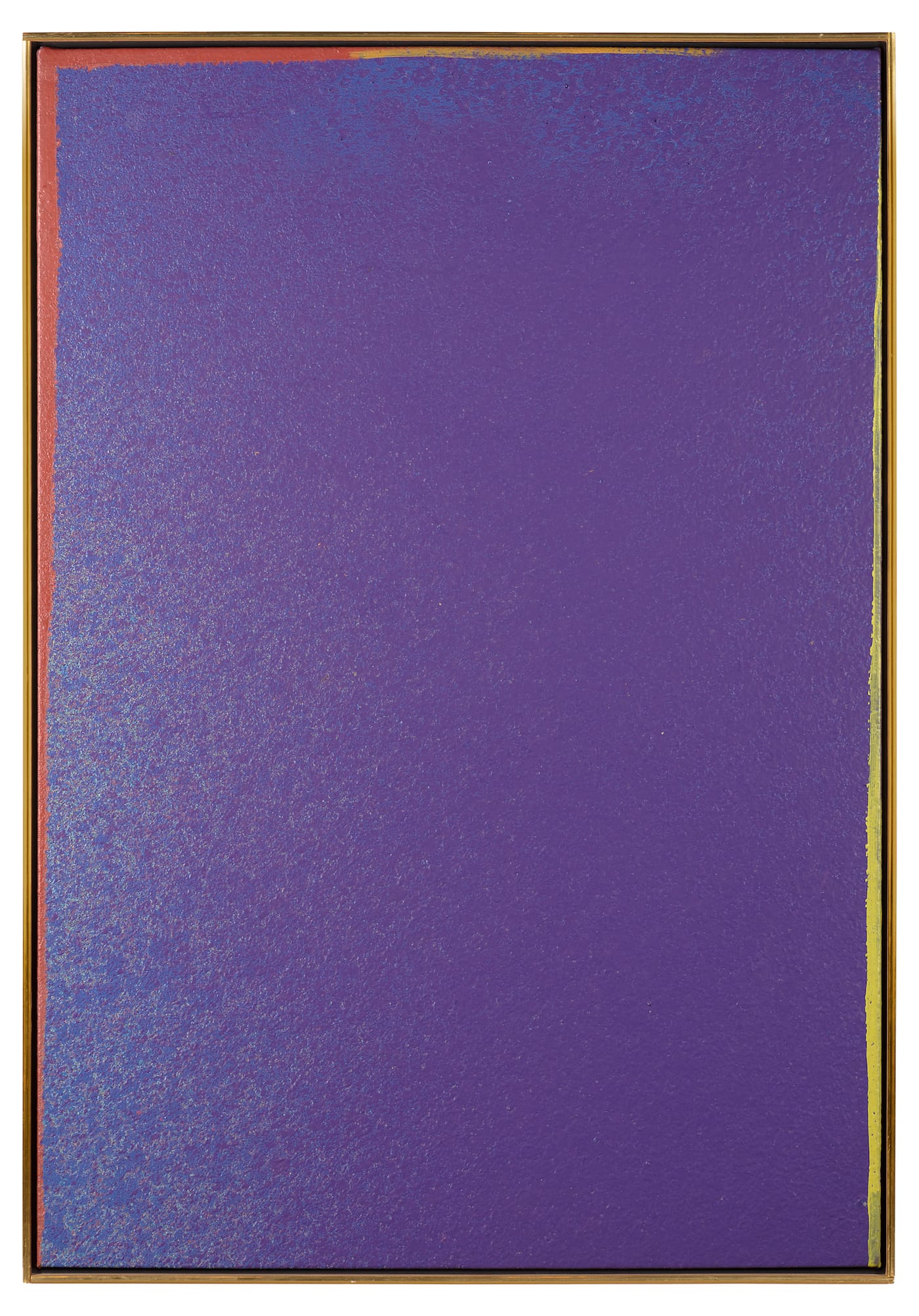 When we remember Olitski’s traditional art education at the National Academy School and his saying that, as a young artist, he “wanted to be Rembrandt,” we begin to see paintings such as “Tut Pink” not only as modernist affirmations of the associative power of color, but also as chromatically rich distillations of the dramatic chiaroscuro of old master painting, detached from illusion but still capable of stirring us. Olitski presents what we might read as a range of infinitely expansive, disembodied sheets of color, in different sizes, until we are stopped by events at the borders of the paintings: bands of color, masked off to “escape” from subsequent spraying or applied as punctuation with a brush. The “edge drawing” asserts the importance of the size, shape, and proportion of the hovering hues before us, marking the boundary between the painting and the everyday world. It affirms the status of the picture as a discrete object, as insistent as anything else around us, but demanding a different quality of attention and provoking different responses than ordinary things.