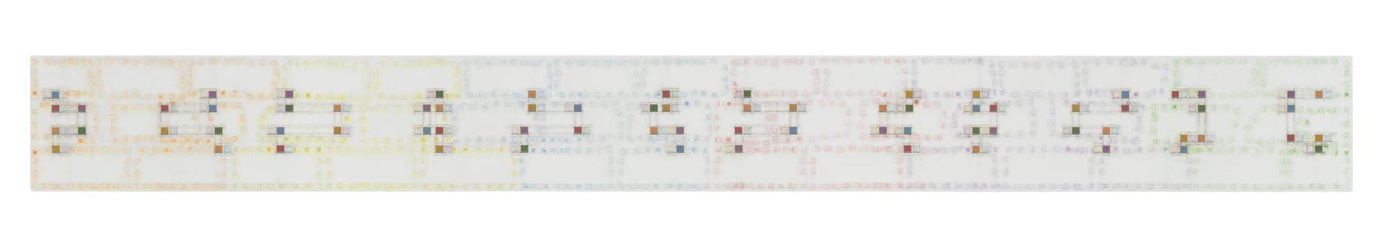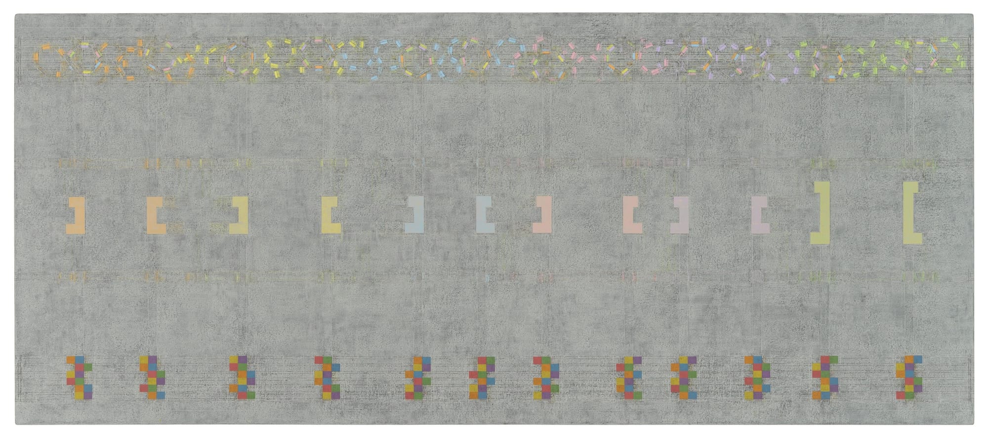 I found myself standing on the opposite side of the room, looking at “Threshold – score for six Plans [chambered spectrum : east to west] : for E C N” (2017-19), which measures 30 by 70 inches, and is the only work on its wall. Along the painting’s bottom edge are six evenly spaced pairs of “chords stacks,” composed of staggered squares in six colors. A horizontal row of paired bracket-like shapes spans the middle of the painting. These seem to suggest a threshold; the largest pair, placed on the far right, indicates the primary entrance into what I presume is Fish’s house. Along the top are many small shapes in various colors, floating on a series of parallel lines across the painting.
