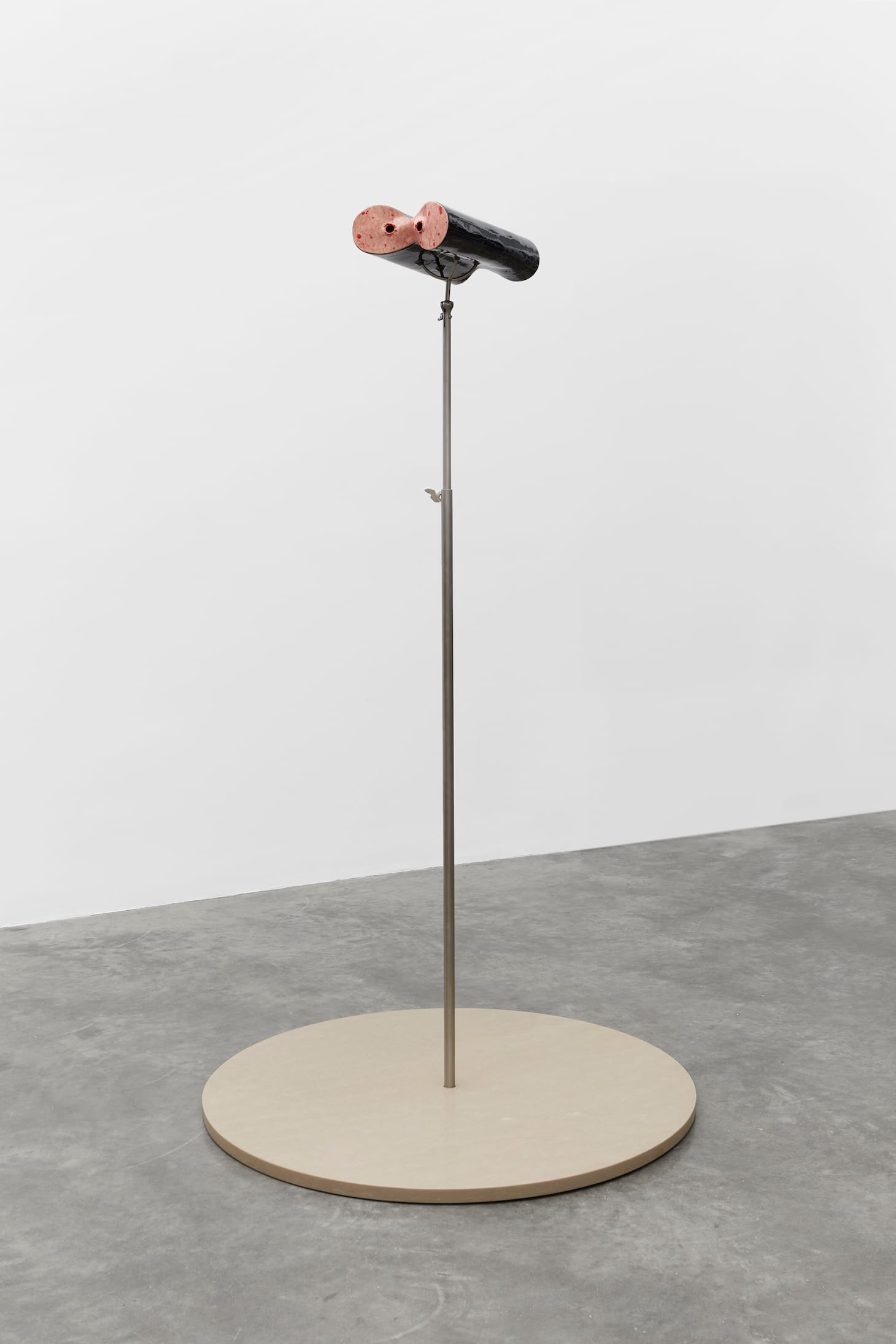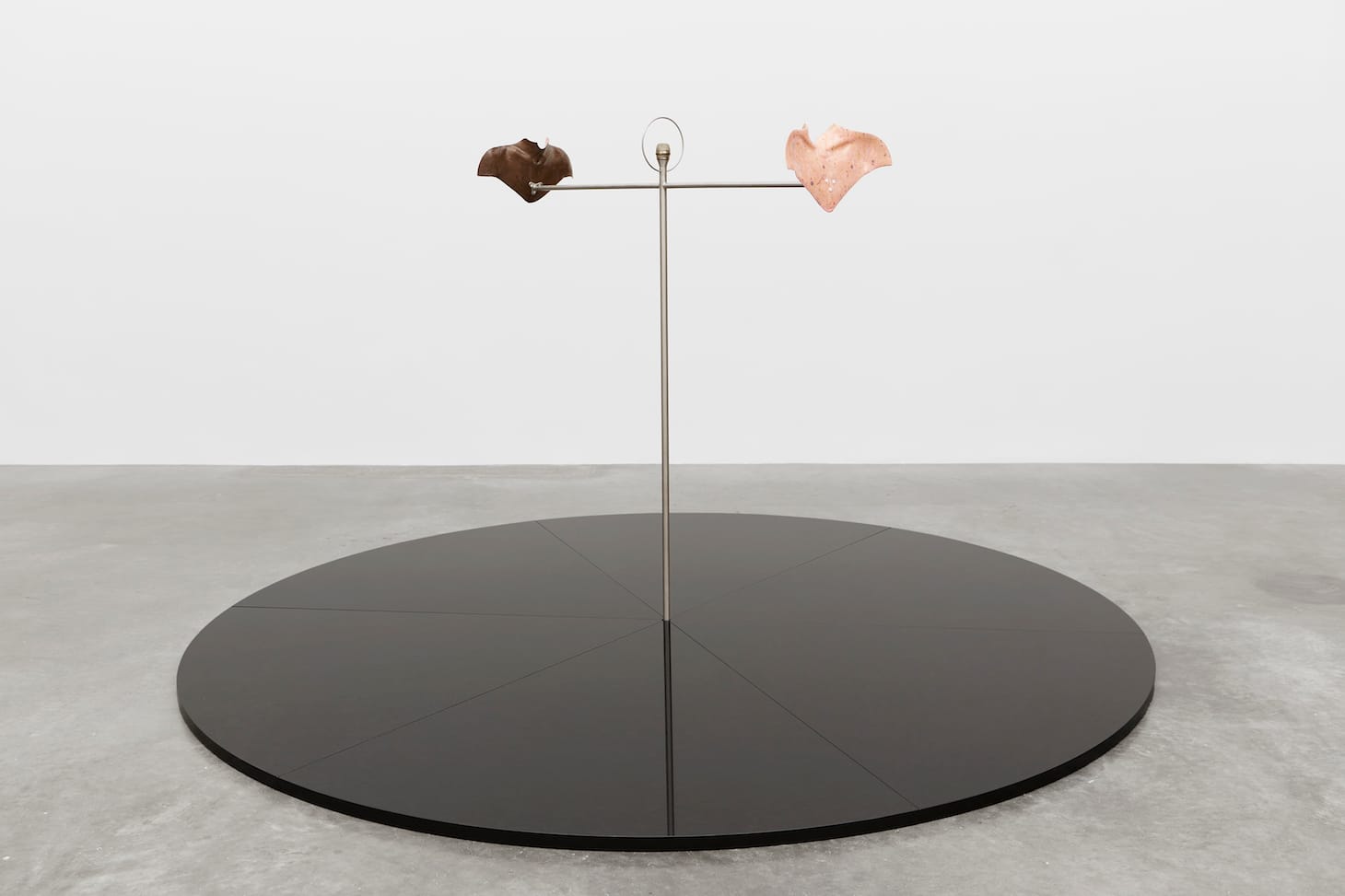 In “Mediator” (2020), there appear to be two human collarbones — one racialized as white and the other as Black — perched on a microphone stand affixed to a large, black, circular platform. An allusion, I presume, to race relations and mediated dialogue. The circular platform, one of the physically largest components of the whole exhibition, might signify the scale of the issue itself.