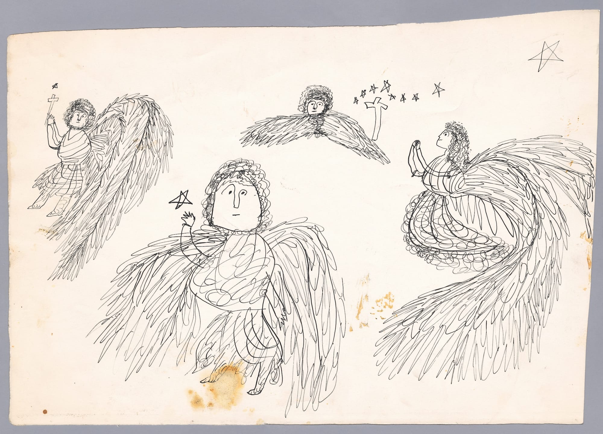 Classism often obscures the fertile proletariat soil from which much American modernist art grew, but studies such as Rusinko’s remind us of the ethnic and working-class origins of those artists. For Julia Warhola was not just a passive actress in Andy’s films, but the calligrapher and co-illustrator for books like the charming 25 Cats Named Sam and One Blue Pussy and Holy Cats (1954), which combined her love of angels and felines. As a solo artist, she won a Certificate of Merit from the American Institute for Graphic Arts in recognition of the 1957 album cover design for the seminal experimental record The Story of Moondog. And yet the attribution of these collaborative works? “Andy Warhol’s mother.” Rusinko’s book reminds us that she, Julia, was much more than that.