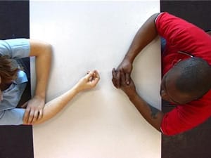 With “One of Us,” Rudelius creates a visceral Freudian purgatory. A feeling of limbo is also captured in the program’s eeriest piece, “Adrift.” In this mysterious 2007 video, a group of dozing people sit in a room that appears to be rocking back and forth. On the soundtrack, the viewer hears moans, chants and an industrial-sounding hum, but the sources of these sounds is not evident. The camera pans across the room, occasionally zeroing in on the sweaty, flushed faces of the inhabitants, whose eyes remain half or fully closed. Where are they going? What are they waiting for? Are they engaged in a ritual of some kind? The answers are never made clear.