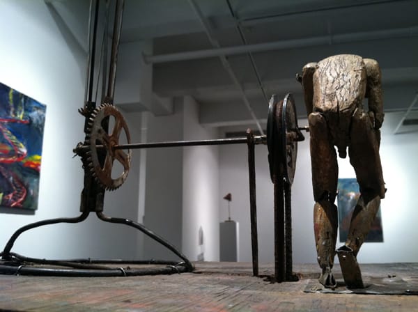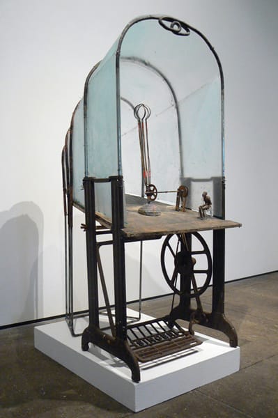 Much of her work features miniature men and women that have been cobbled together by scraps of wire and tin. Often, they are engaged in some activity — turning a crankshaft, descending a staircase or climbing up a ladder. In “Untitled (Theater),” she constructed a miniature diorama that sits on top of an antique sewing machine. The tableaux features two characters. The first figure is seated on a chair, near the foreground. The second figure, whose back is to the audience, runs to the edge of the stage, just past a giant crankshaft. In “Untitled (Figure Cranking),” a naked man, stooped-back, turns a hand crank, which is attached to a large device that serves no discernible purpose. The figure is small. Some people may describe him as puny. At best, he’s six inches tall. What gets me is Leaf’s attention to detail. She made sure to include the figure’s scrotum and penis.