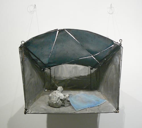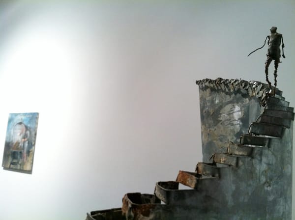 Her two-dimensional work seems to be an extension of her sculptures, perhaps offering the artist more time to ruminate. Motion is almost always suggested. In the painting “Couple Walking,” a duo walks arm in arm, as if whistling in the abyss. Though the painting is no more than a few smears of acrylic paint on a patch of tin, the picture resonates. In “Figure Descending Staircase,” a thin tin man — held together by soot and wire — walks down a winding set of stairs, one step at a time. I love how the staircase begins and ends in a void, leading nowhere. This is the stuff of dreams.