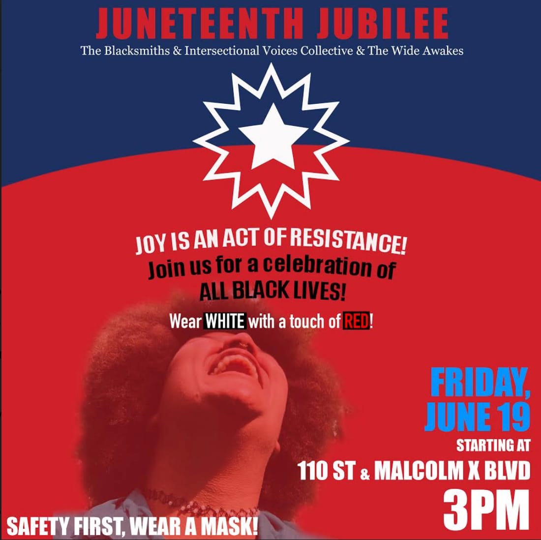 In an effort to celebrate Black joy as a form of resistance, a coalition of artists, curators, event producers, and organizers is teaming up to put on the Juneteenth Jubilee in Harlem, one of New York’s historically Black neighborhoods. Demanding the recognition of “Black American agency and ingenuity,” the organizers are asking folks to join them for festivities that will welcome all Black people, “with special attention to Black queer and trans persons,” and include performances by Maluca, Shyvonne, Vuyo Sotashe, Mwenso & the Shakes, and more. There will also be voter registration assistance and attendees are being asked to wear white with “a touch of red.” (Please wear a mask to curb community spread.)