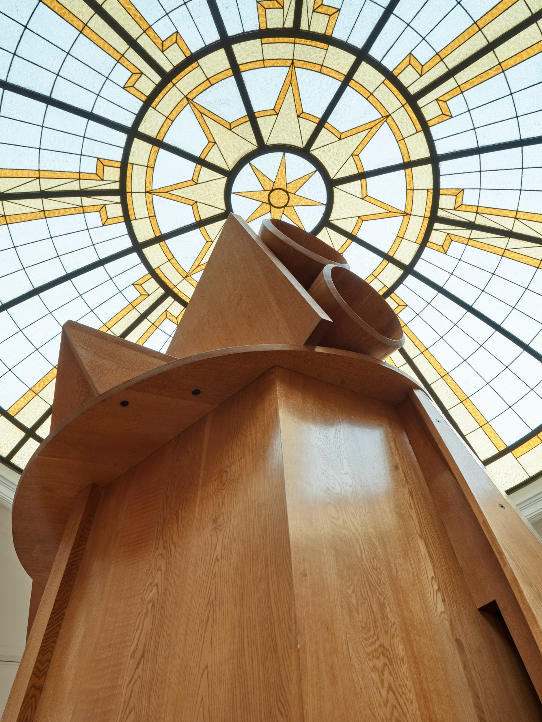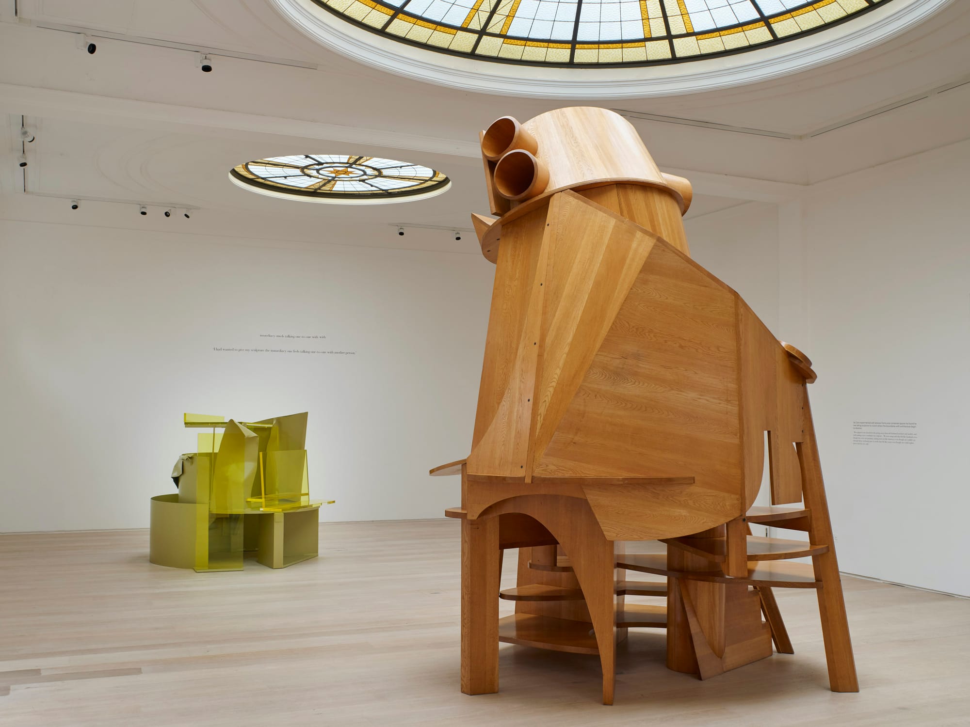 The largest of the sculptures is in the central gallery, which faces you as you enter. “Child’s Tower Room” (1983–84) — with its high gleam of varnished Japanese oak — is a kind of crazed stir-fry of three quite distinct ingredients: Tatlin’s tower, that unrealized monument to the Third International; a wheeling fairground helter-skelter; and an off-kilter pepper pot. In short, it’s wild — and children are loving it to bits this morning because it contains a spiraling staircase, which you can ascend as high as the viewpoint of your dreams.