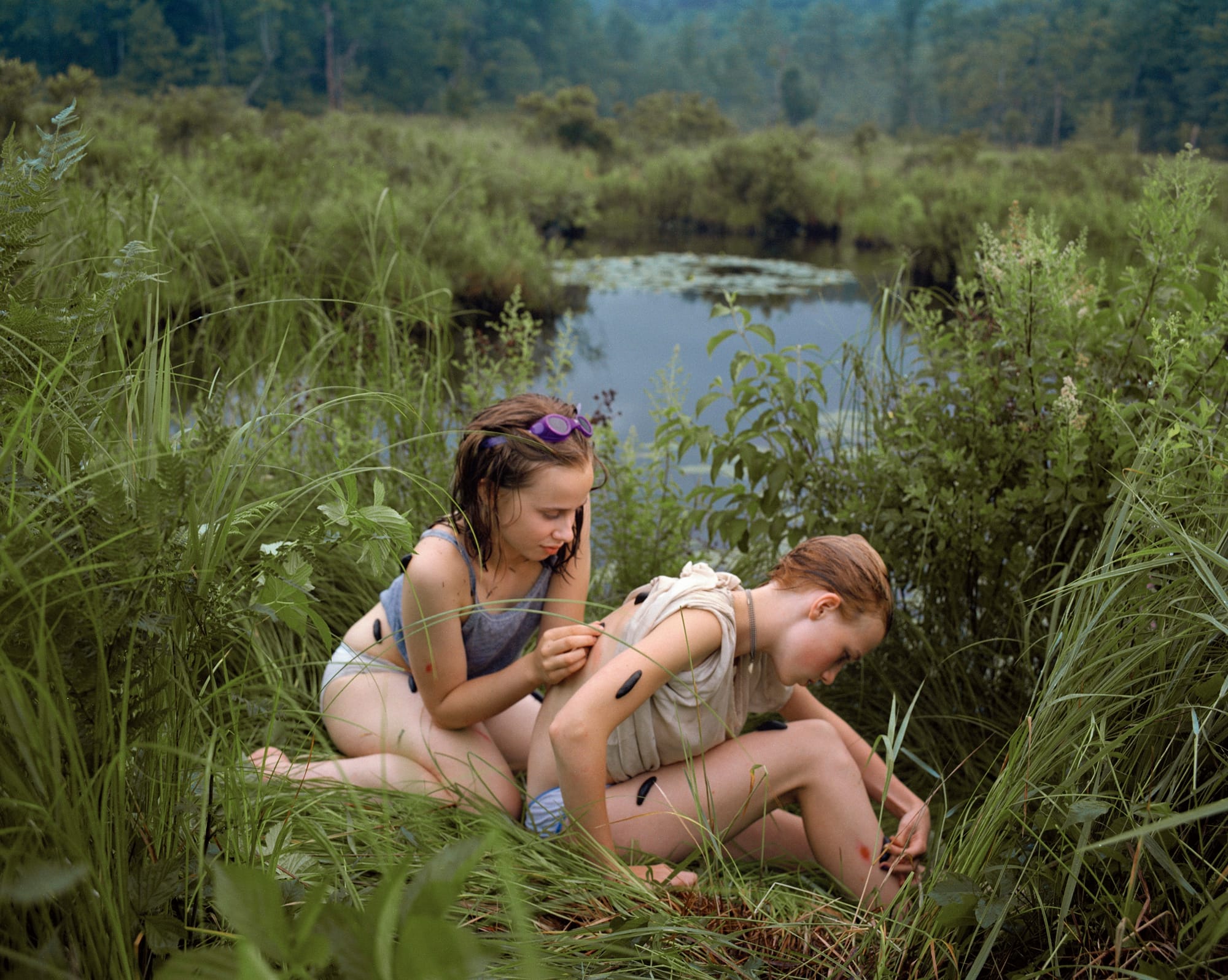 In one particularly painterly image titled “Poison Ivy” (1999), two young girls sit in the tall grasses next to a pond. Their clothes and hair are still wet from swimming, and one wears purple goggles pushed up on her head. Gingerly they place leeches on their bodies, leaving behind red bruises on their pale skin. Despite the sinister presence of the leeches, the scene is suffused with a peaceful, impressionistic glow.