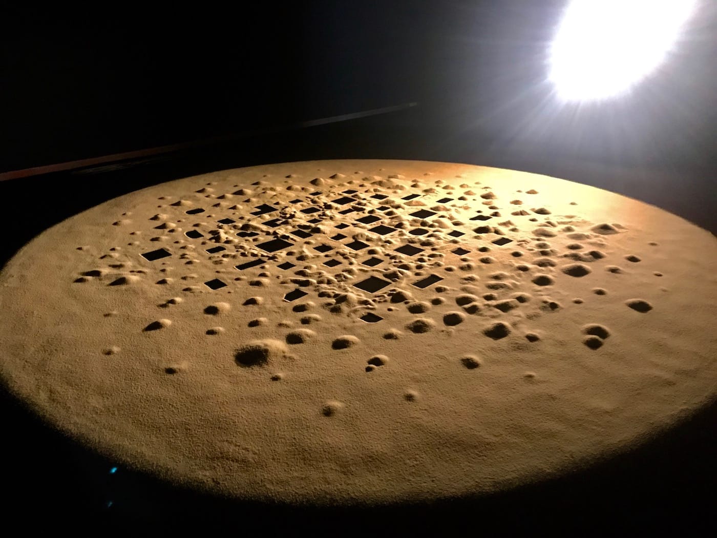 A French-Algerian artist now living and working between Berlin and Algiers, Attia takes a poetic approach to exploring the repercussions of colonialism on the sociopolitical, linguistic, and visual outfits of everyday life. Entering his exhibition, visitors will first see “Untitled (Couscous)” (2009), which sprawls across the center of a pitch-black room. This recreation of a desert city from a bird’s eye view is as haunting as it is heartbreaking. Here, the black squares and rectangles are reminiscent of the video footage from military reconnaissance planes, or more recently, drones. What Attia captures is the inability for such surveillance technology to properly distinguish buildings — let alone people — from each other. The viewer is left wondering if this image is supposed to be before or after an attack. Are these designated targets or the ruins of the targeted? Couscous scatters across the floor, crumbs tapering off into the darkness of the black rug.