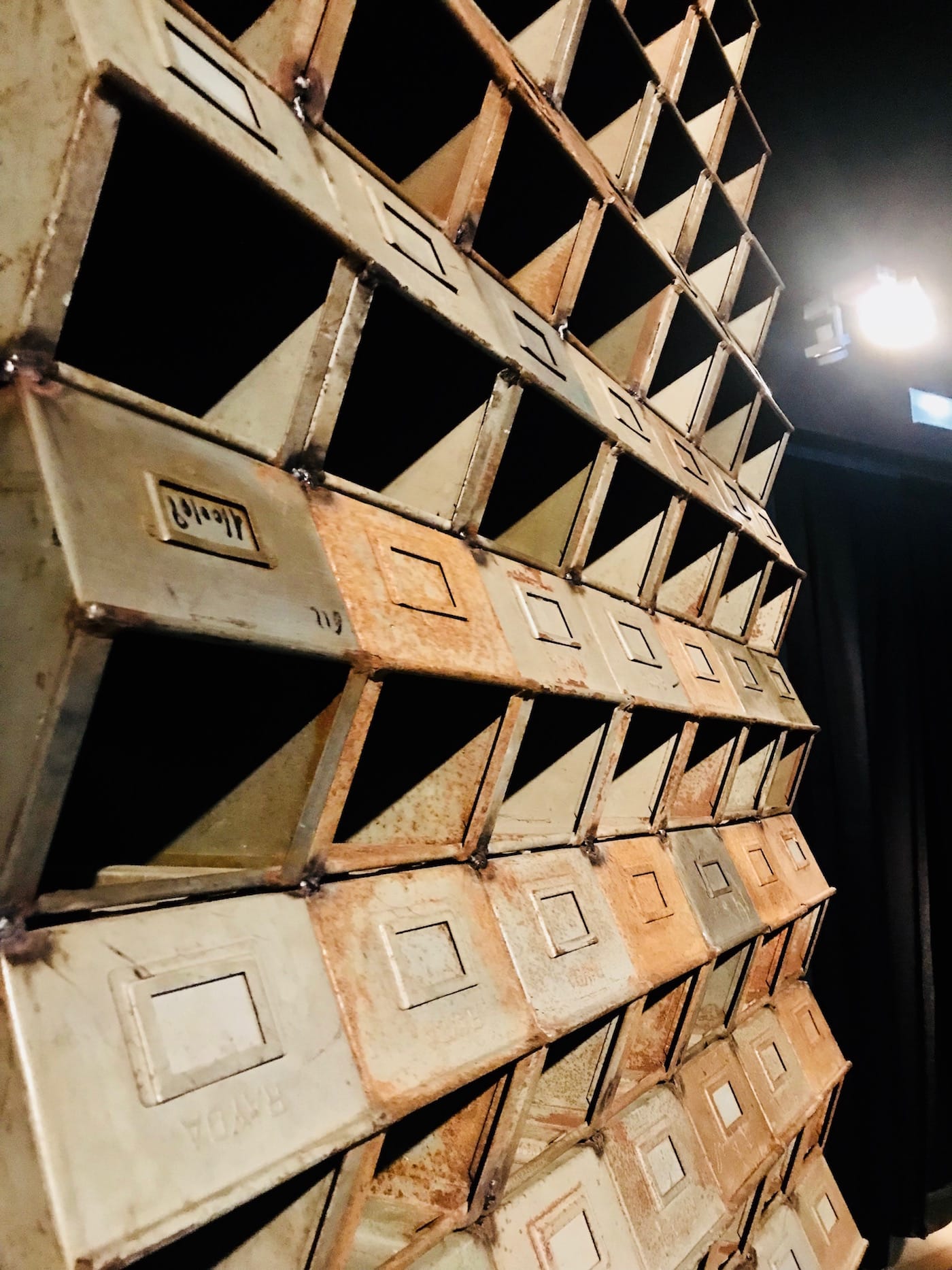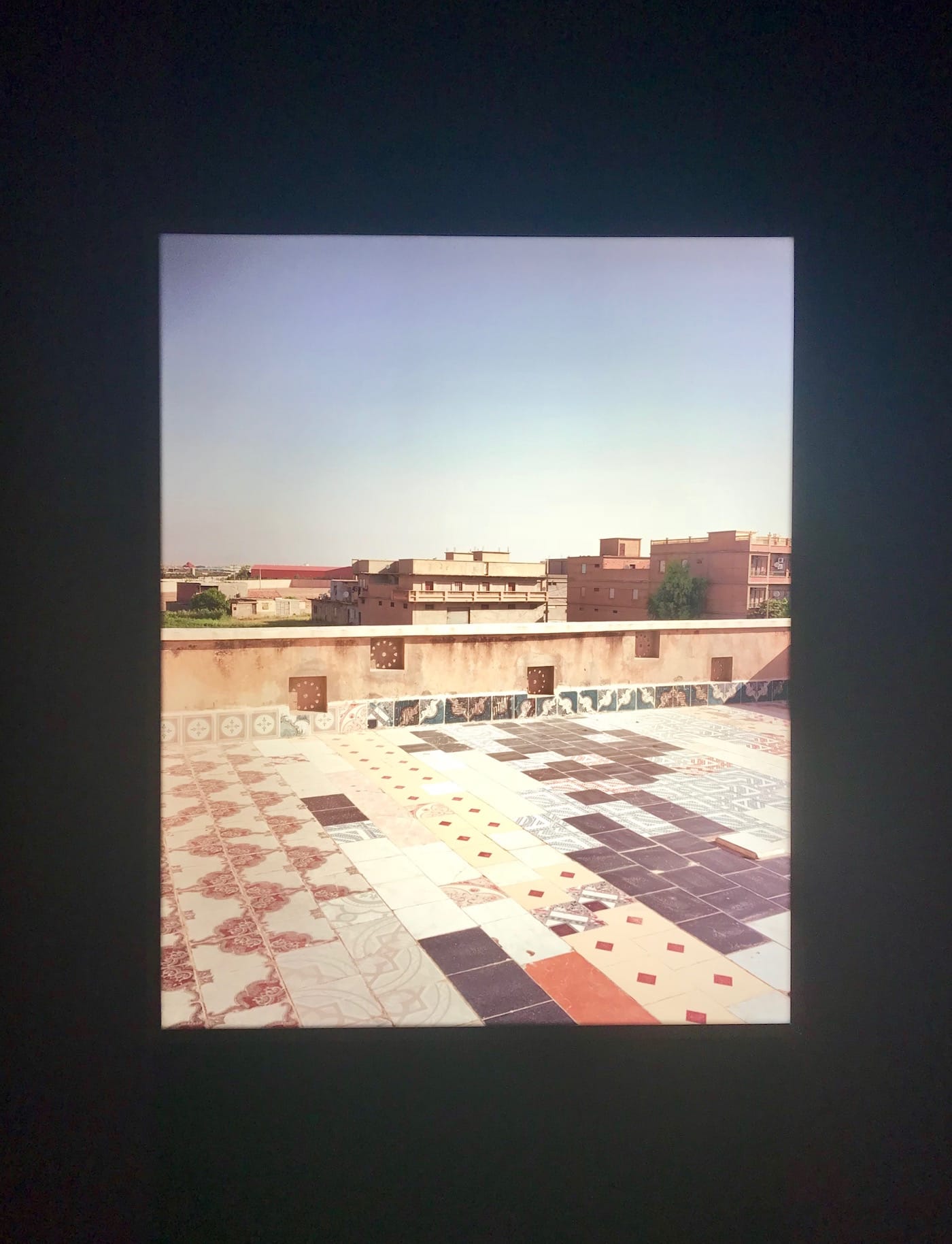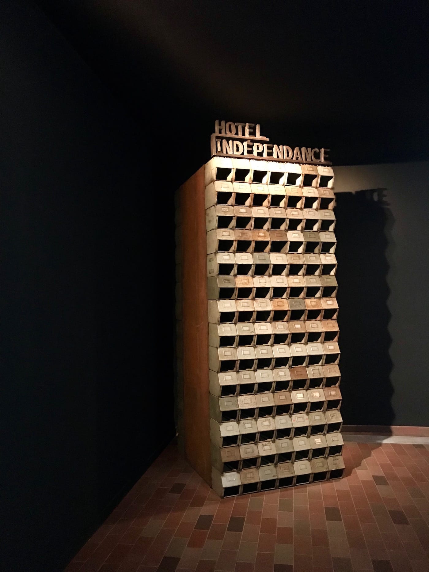Turning the corner from this gallery is a lightbox work called, “Dé-construire et Ré-inventer” (2012), which gives more context to the previous work. There’s something indexical about its presence, as if this image cast in a bright light is meant to articulate the tops of the buildings that we couldn’t see in the previous room. Attia continues to articulate the cityscape with his next piece, “Indépendance Tchao” (2014), which recreates the Hotel Indépendance in Dakar, Senegal with metallic boxes taken from the French colonial administration. An echo of the real deal’s modernist façade, “Indépendance Tchao” emphasizes the illusion of independence; its rusting structure is a critique of the postcolonial regime to deliver on the supposed economic bounty that independence was supposed to bring the African continent. Instead, one could argue that postcolonial states became rentier states still beholden to their former masters for trade relations.