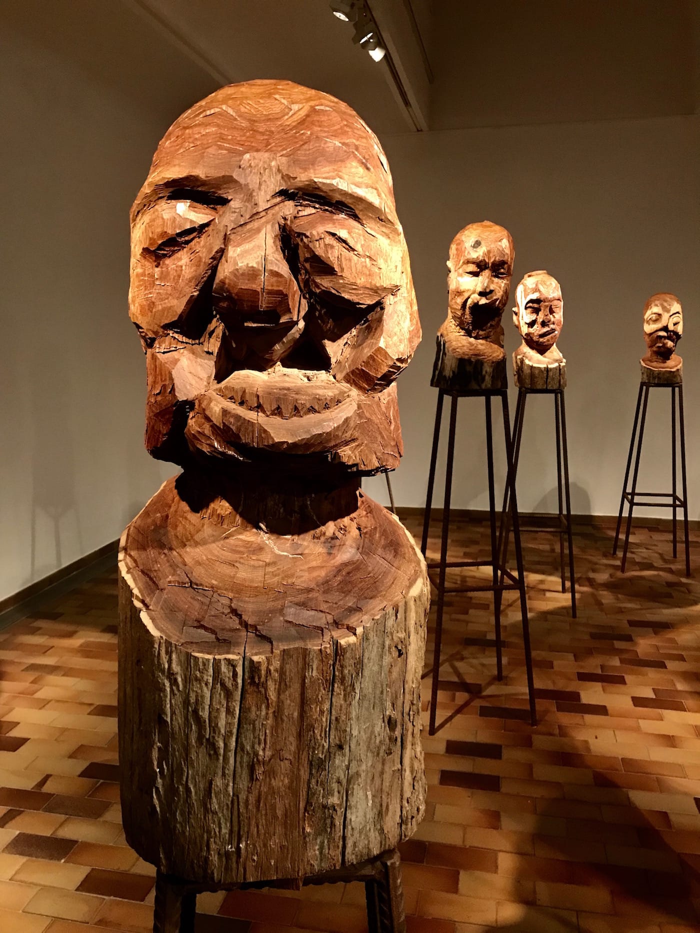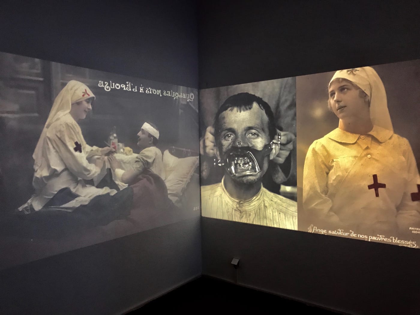 There is a single room toward the end of the exhibition that I will likely remember for years to come. In a previous room stood dozens of metal sculptures that emerged from stone pills like jagged, rusted trees. Here, though, the rusted metal bars support wooden sculptures formed into the mangled faces seen in “Open Your Eyes.” These faces are aimed toward the gallery’s entrance, where a screening of Abel Gance’s 1919 antiwar film, J’accuse! plays. There’s something chillingly poignant seeing these wooden faces, carved from hundred-year-old trees, watching a movie about the brutality of World War I that led to the gashes on their faces. This interplay allows the viewers to conceptualize the permanence of scars and the phenomenon of scars as witnesses to their own creation. And if scars are permanent — if they can’t be photoshopped out of life — then we must reckon with their image.