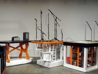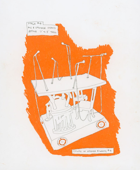It’s cold at the Whitney in the little room in the lobby by the elevators. Here, Martin Kersels has designed a sculpture in the shape of a stage upon which performances can be created. Entitled “Five Songs,” it’s hard to evaluate as a work of art while I’m sleeping on it. Five semi-fantastical stages are painted black, white and orange. There’s 1) a go-go dancer booth atop some speakers, attached to 2) an oval-shaped black table, which I am sleeping under, connected to 3) another stage with upside down chairs supporting it, leading to 4) one made of glass that holds our props, from which 5) a very small stage protrudes that looks like the bow of a ship. The part I am sleeping on is made out of wood and is surprisingly comfortable.