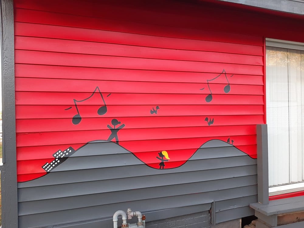 Queen Rose is newly alive in the city’s historic Kendall Whittier neighborhood after Linzy secured an Arts Integration Award from Tulsa Artist Fellowship and bought the house in August 2021. Passers-through will know the house by its facade, painted with vivid motifs from Linzy’s early works on paper. Fans of his soap opera video art series As Da Art World Might Turn will recognize the playfully stark red, black, and white from clothing made popular by the character Katonya, an artist and mother who finds support from relatives — bloodwise and heartwise — on her journey. The music notes and figures, set in dramas of need and repair, also appear on a truck in the Queen Rose Art House driveway, the first impression visiting artists will have when Linzy picks them up from the airport.