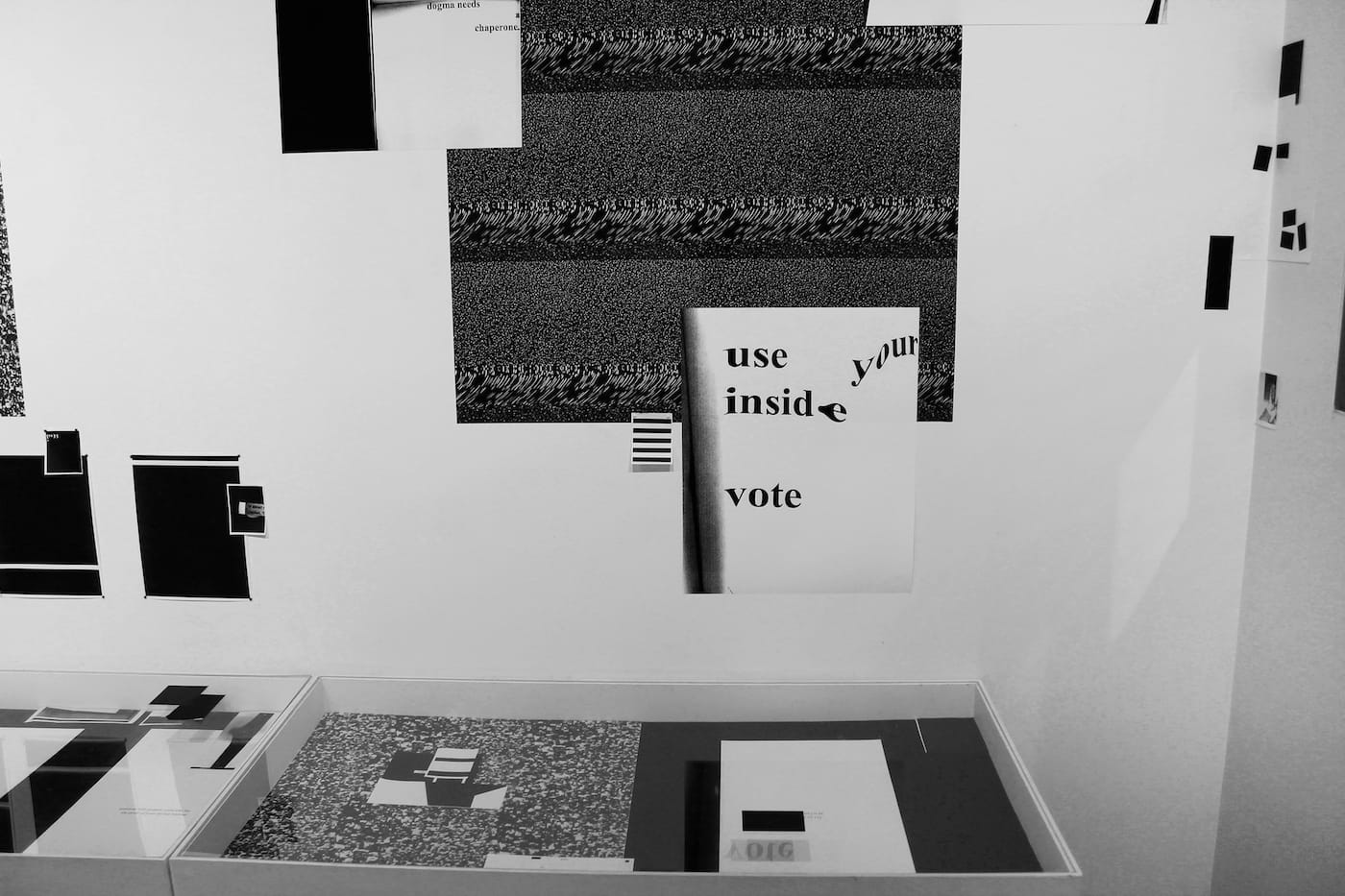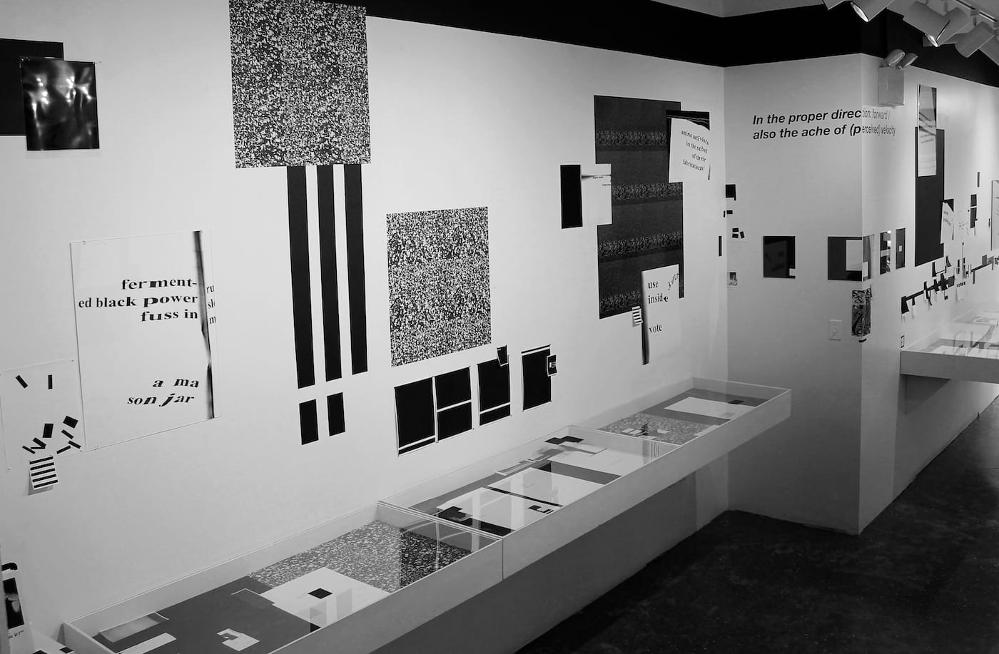 Given the textual nature of this work, the back exhibition room at Printed Matter, the Chelsea neighborhood artists’ book store, is an apposite space for Rasheed’s latest installation, in the proper direction: forward/ also the ache of (perceived) velocity. For the show, Rasheed arranged variously sized black-and-white paper rectangles along the room’s narrow parallel walls, as well as in adjacent vitrines, in a manner that recalls a timeline. Sporadic snippets of wavy and distorted poetic text appear throughout — such as the punning directive to “use your/ inside/ vote” — but most of the rectangles are wordless. In particular, the preponderance of all-black rectangles creates the impression that much of the work has been redacted.