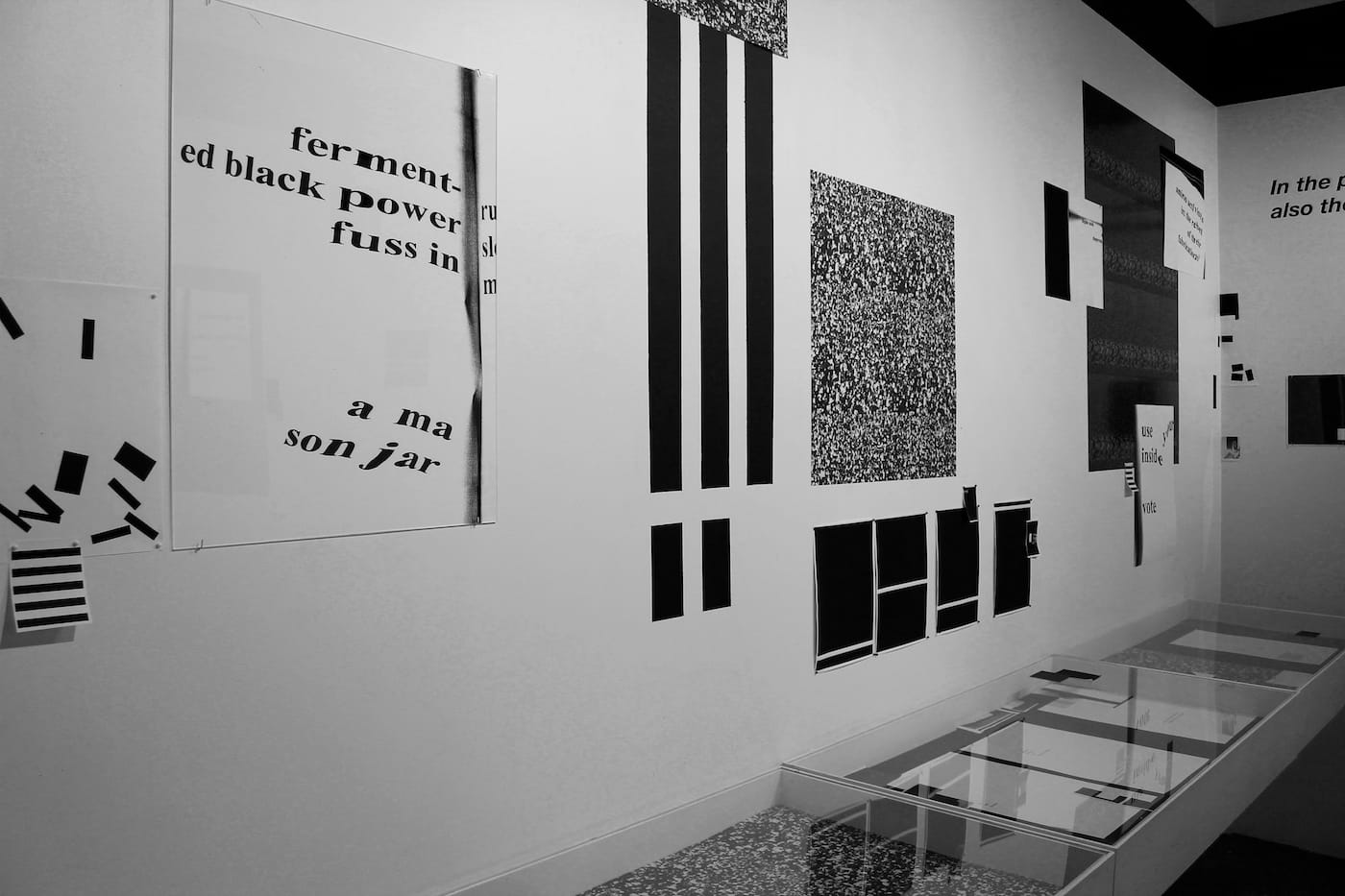 Rasheed extends such investigations in her own unique direction. While most Oulipian theory emphasizes the paradoxically liberating effect, for artist and audience alike, of artistic constraint, Rasheed’s installations appear agonizingly straitjacketed — “ferment-/ ed black power/ fuss in// a ma/ son jar,” reads one twisting and self-interrupting language scrap. As a black, Muslim woman, subject to any number of externally imposed strictures, Rasheed seems dissatisfied with the idea of adopting this freeing technique for merely aesthetic purposes. Instead, she captures a sense of what the poet Fred Moten calls the “fugitive” nature — elusive out of necessity — of black sociopolitical resistance in the United States. Like the work of Glenn Ligon and Christopher Wool, artistic predecessors who have worked with black-and-white textual accretion and erasure, Rasheed’s installations probe the limitations and fissures of linguistic self-expression.