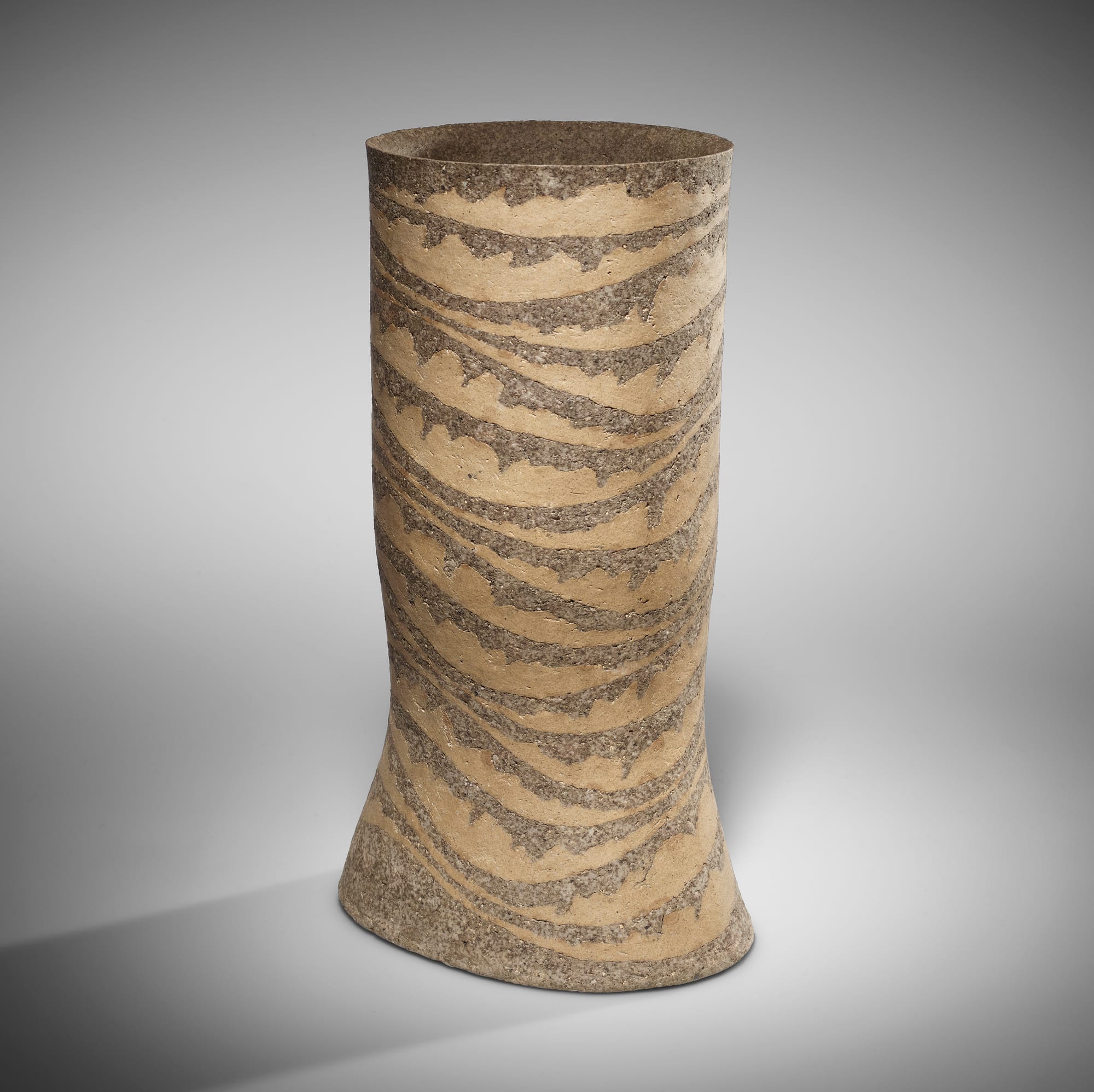 Kamoda Shōji, "Vessel" (1972), glazed stoneware with marbleized decoration, 12 1/2 x 7 1/4 x 5 1/4 inches (collection Joan B. Mirviss and Robert J. Levine)