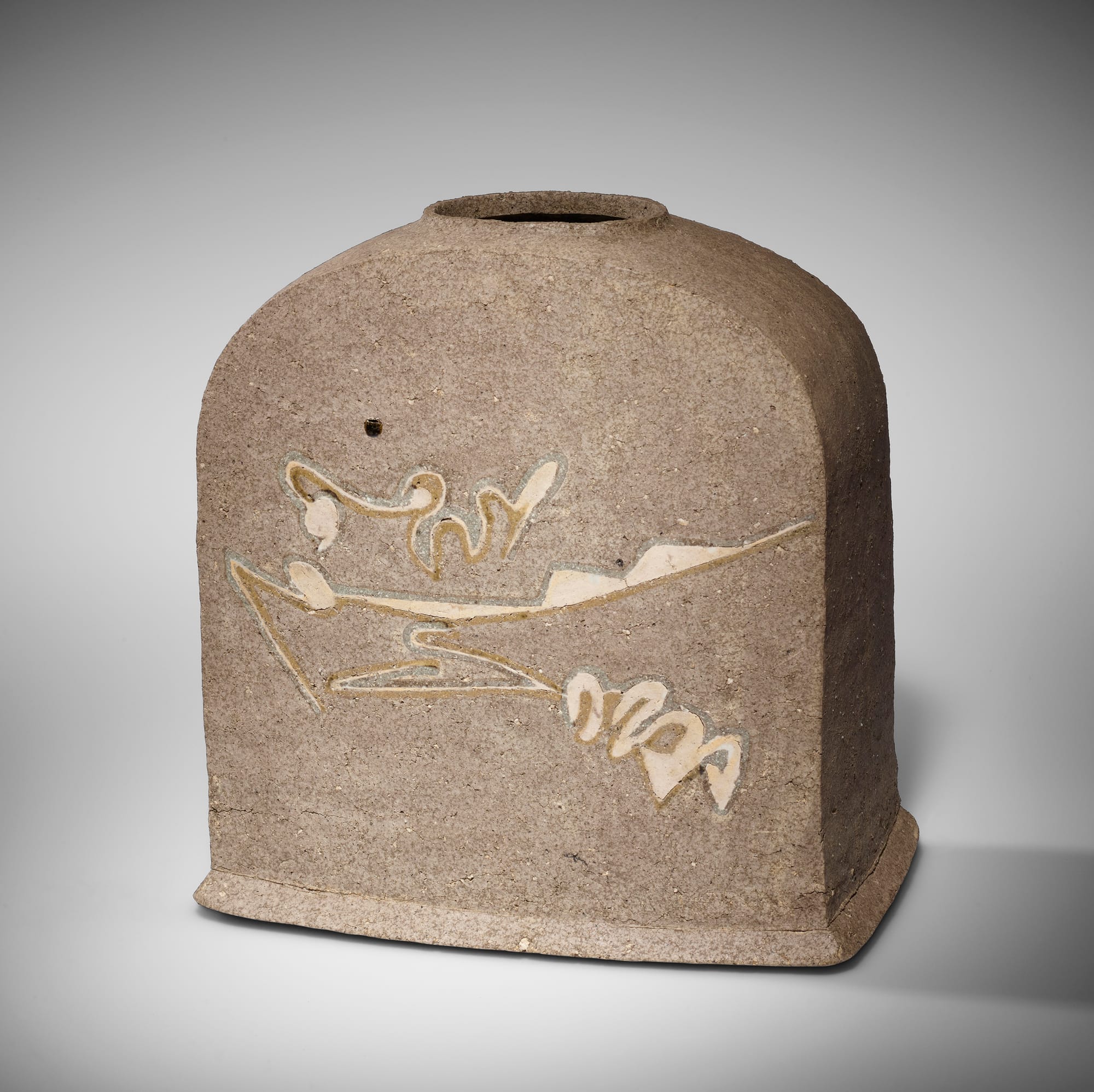 Kamoda Shōji, "Vessel" (1974), glazed stoneware with slip inlady, 9 7/8 x 5 5/8 x 10 1/4 inches (collection of Pilar Conde)