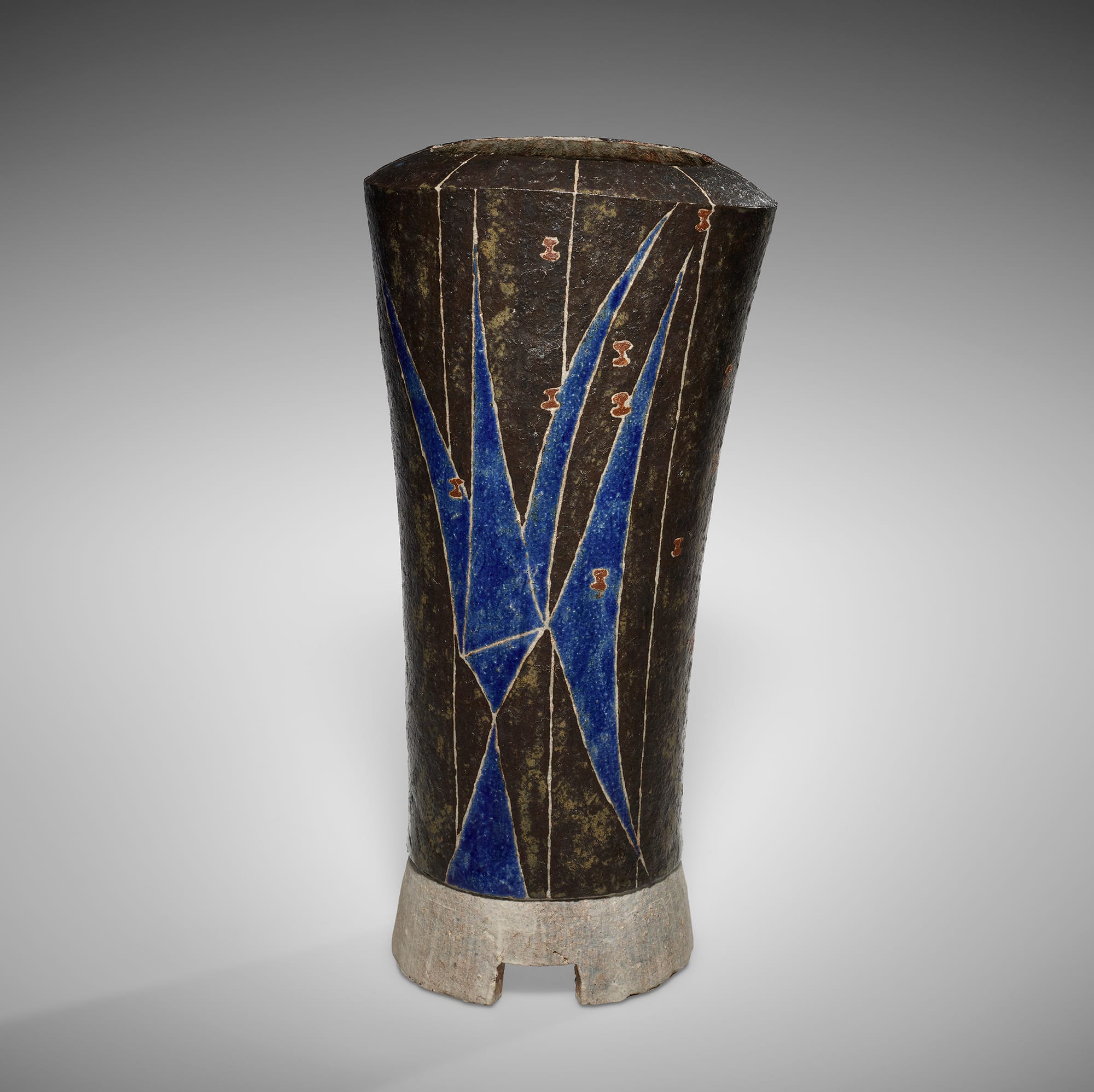 Kamoda Shōji, "Vessel" (1977), stoneware with black slip-glaze and enamel decoration, 14 x 6 3/4 inches (collection of Robert and Lisa Kessler)