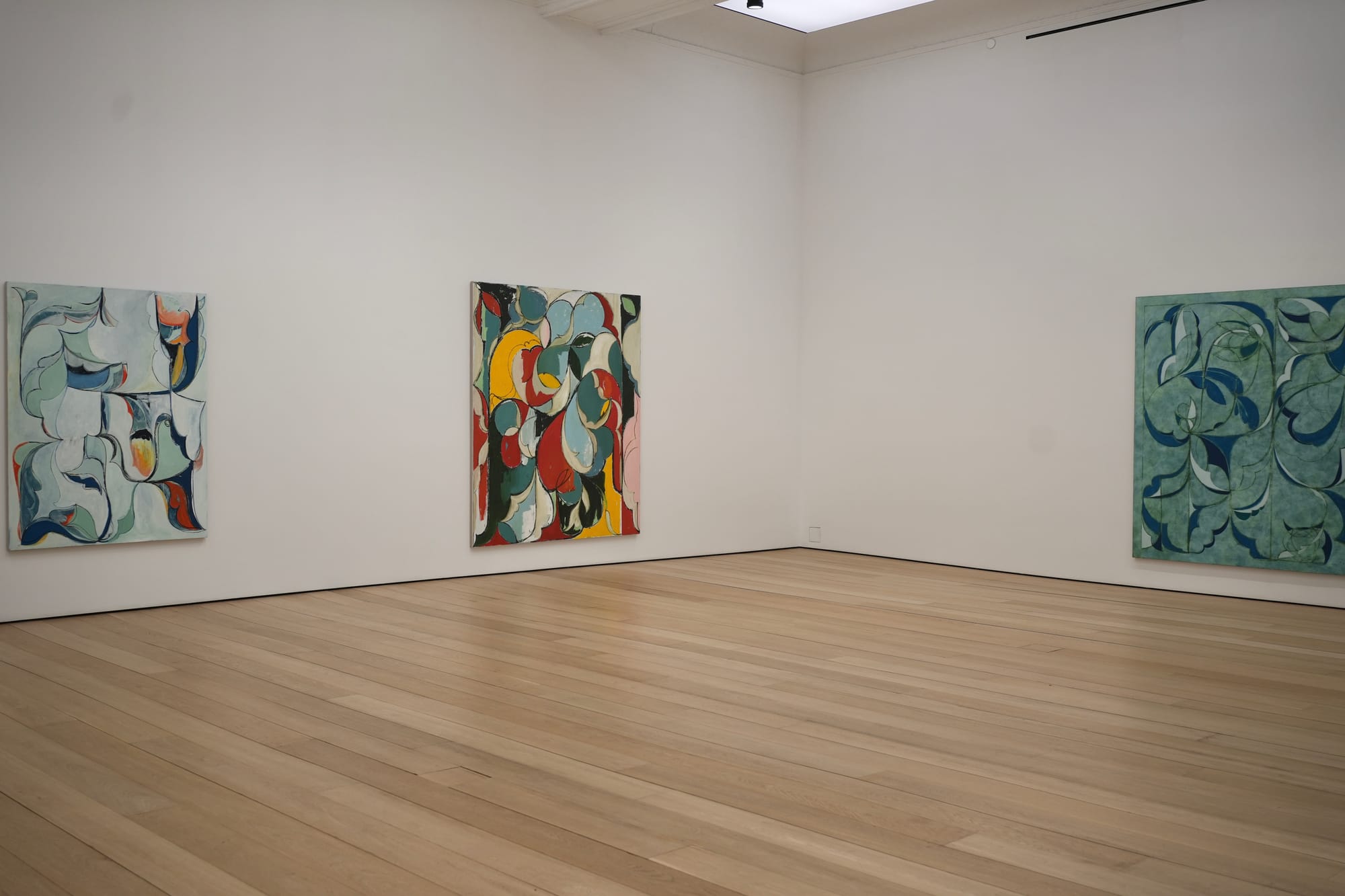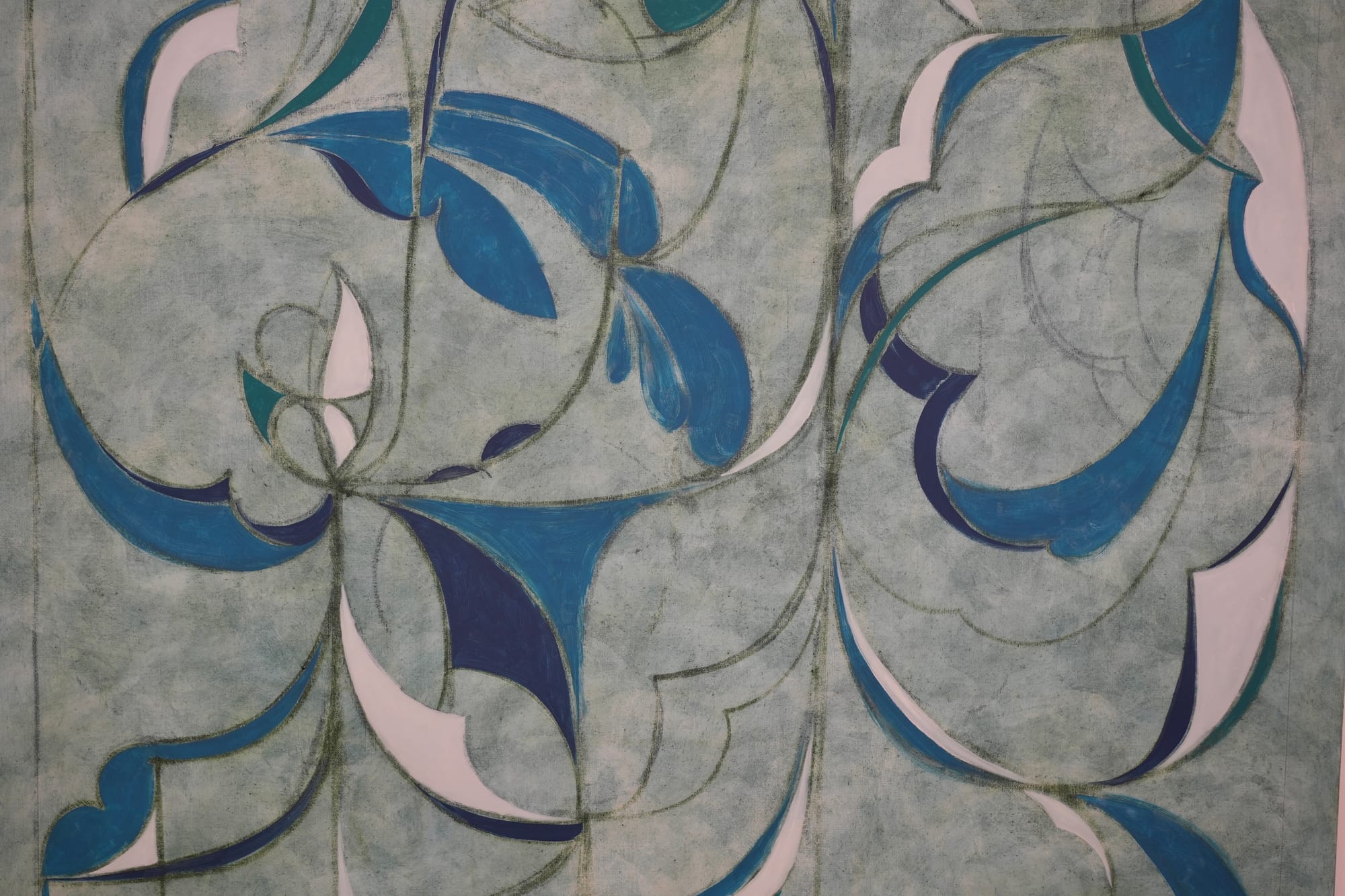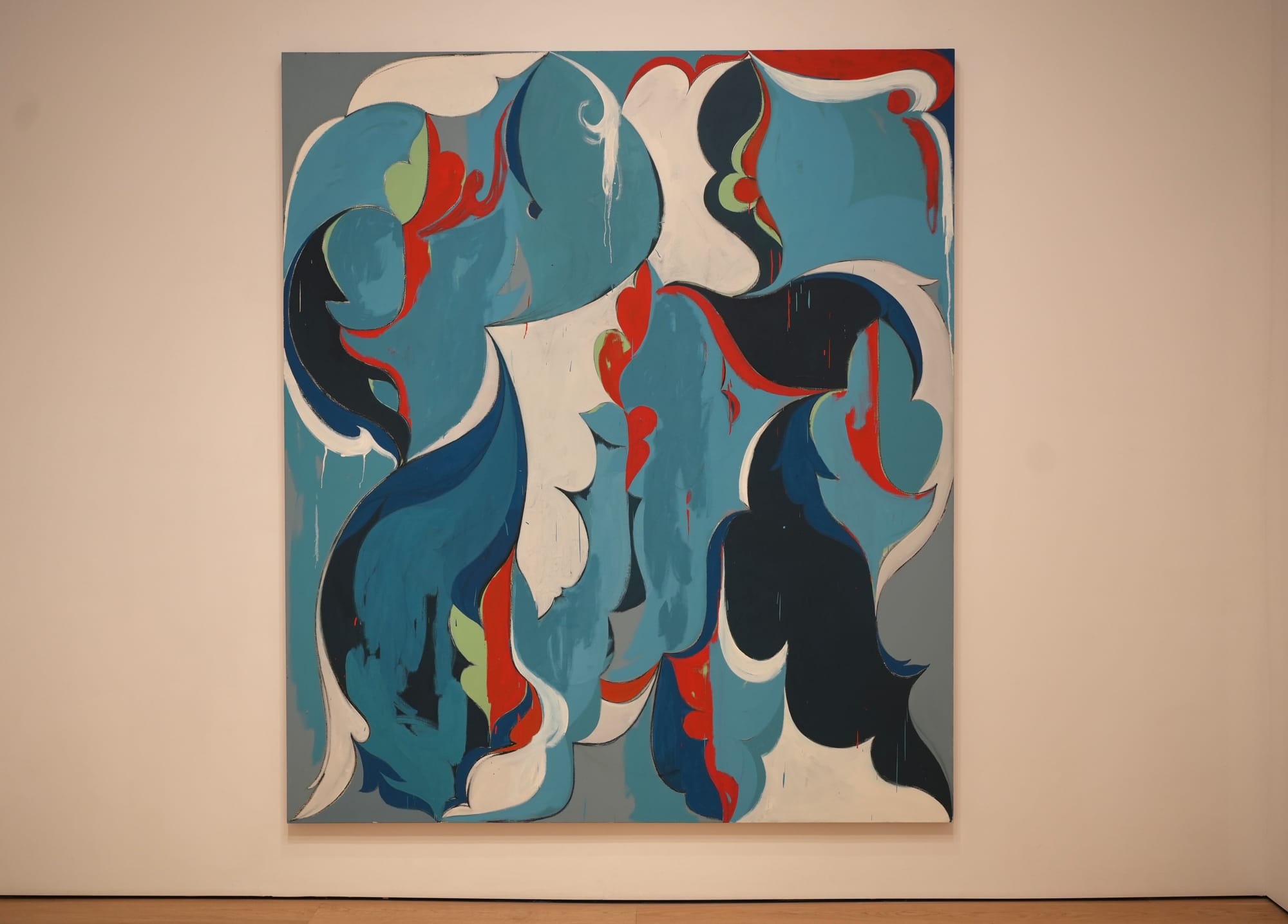 In Mumbai, this grid was on full display, in a series of paintings that emphasized a vertical arrangement across the width of the canvas, interrupted (perhaps complicated is a better word) by curving forms that evoked both the organic (the edge of a flower petal, perhaps a limb or buttock) and the definitively non-organic (enamelwork, the inlay of precious stone in marble). The colors — reds, grays, blue-greens, midnight blues, blacks, and even yellows — likewise sit in a strange space between the natural world and the ur-natural. The problem (or pleasure) of abstraction is the way it acts as a screen for all kinds of projections on the part of the viewer, so indulge me now in my insistence that I saw in these pictures the structure, rhythm, and stylization of Henri Matisse’s “Bathers by a River” (1917), from the Art Institute of Chicago. This callback — and I’m sure this is not the only one, by far — is less a matter of influence than of recasting. It’s a reminder that Matisse’s arabesque — here and in his later abstractions and cutouts, especially — was quite literally a borrowing from Islamic decorative arts. Modernists worked their asses off to distance abstraction from the decorative, and declared ornament a crime, but not without absconding with it in the process.