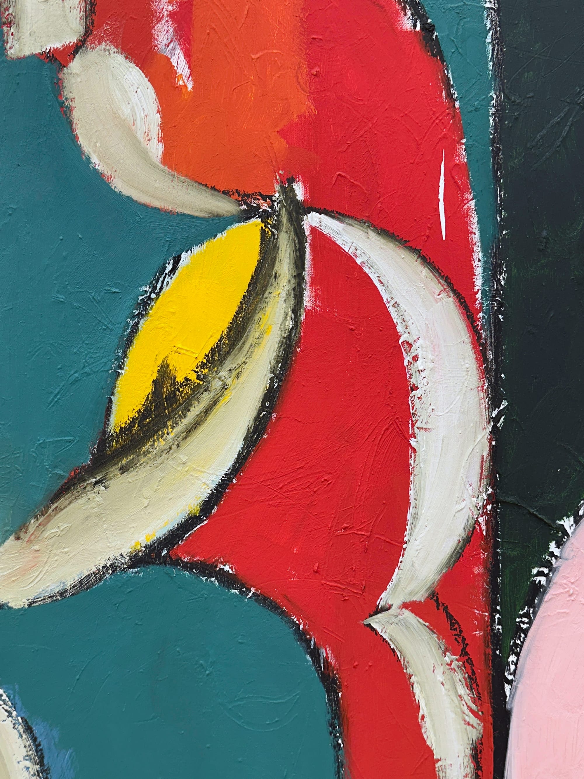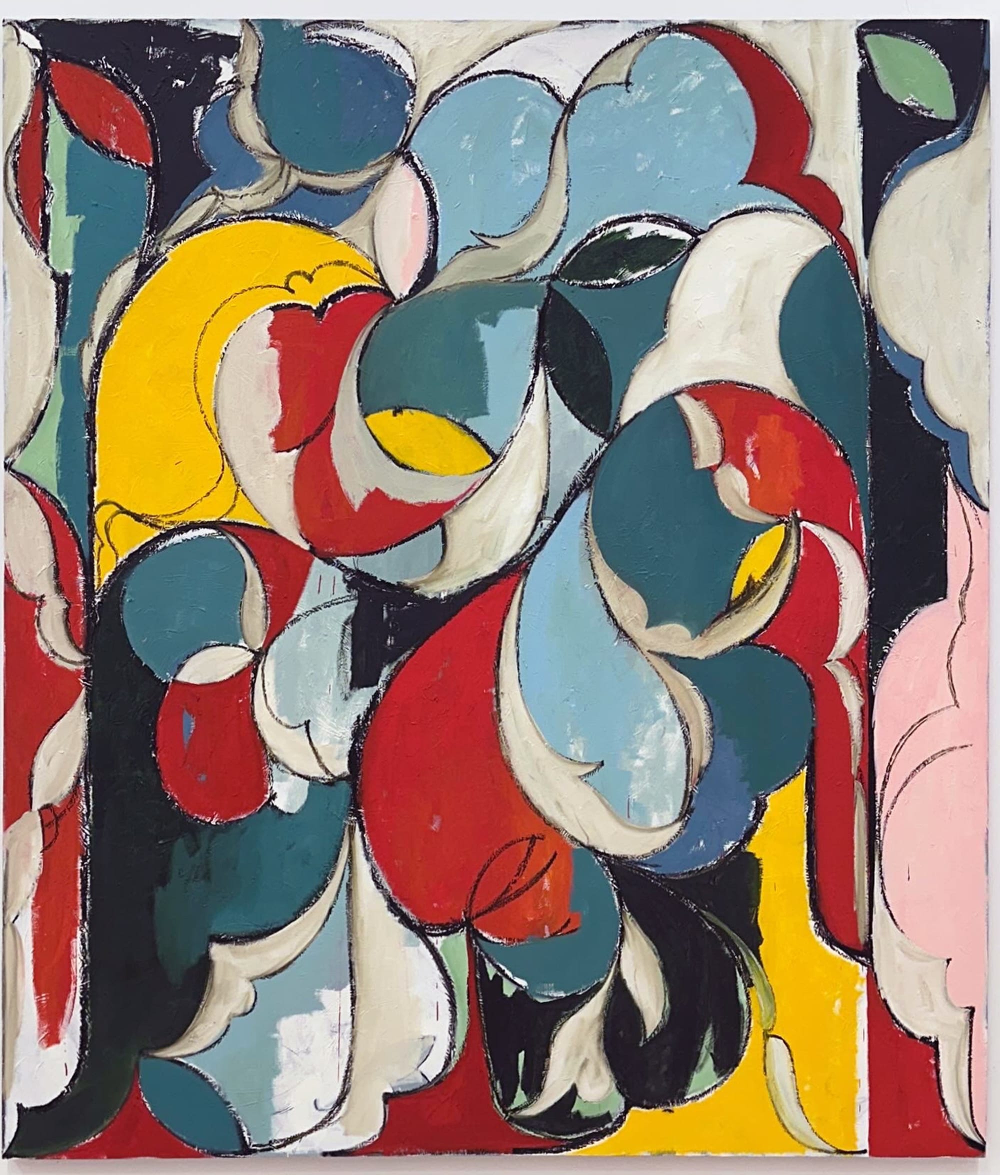 “Old World Telepathy” (2026) is less crisp, more liquid, as if Aram has turned from Matisse to Surrealism or Arshile Gorky or Roberto Matta — or no one at all, nothing but his own play with medium and gesture. Look closely at some passages — a spot where coral and bright orange and banana yellow are held in place by dark blue and black curves, colors overlapping, stuttering outlines barely managing to contain them. You might see a painterly language that has so fully absorbed all the world has to offer that it has become a chimera without a single source, an idiom with many origins but no hierarchies.