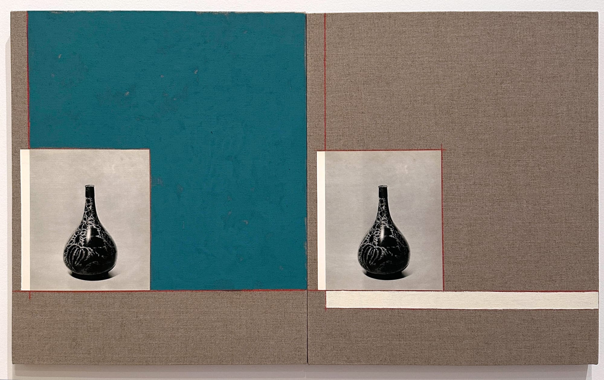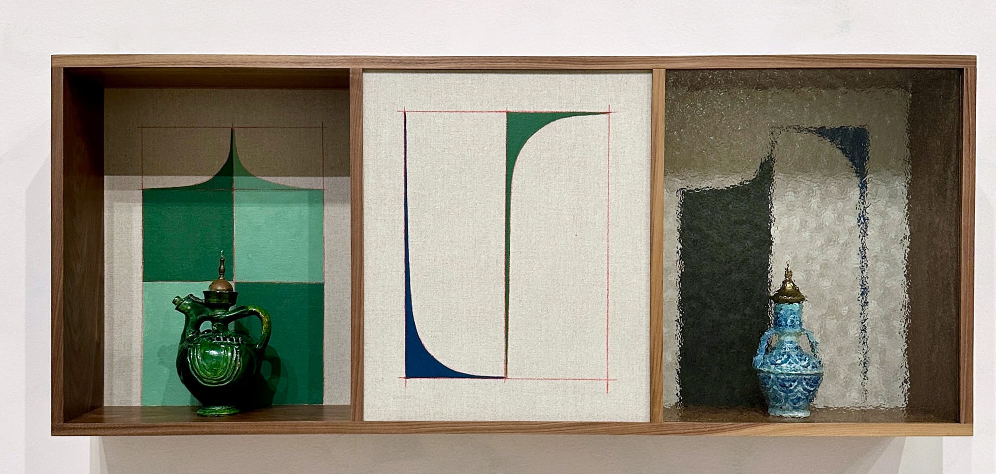 “Requiem for Perpetual Defeat” (2026) offers up real vases — or at least, small ceramic vessels — this time mounted in a tripartite walnut shadowbox. In the left cubbyhole, a green decanter is set against an abstract composition rendered in oil and color pencil. A linen panel covers the middle part, which includes a bifurcated rectangle, the dividing line curving into a meniscus on each side. In the right chamber, we find a piece of blue pottery set against another abstract composition, this one a kind of inverse of the one on the center panel. But that right section is covered by a panel of textured glass; I did a double-take at first, because it looked like nothing so much as a scene from a James McNeill Whistler painting, all orientalism and atmosphere.