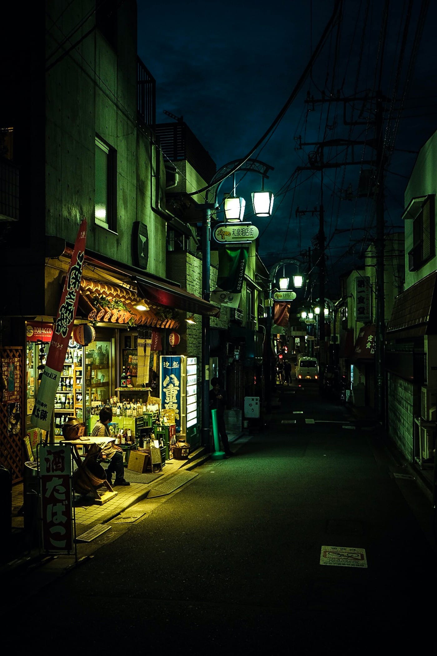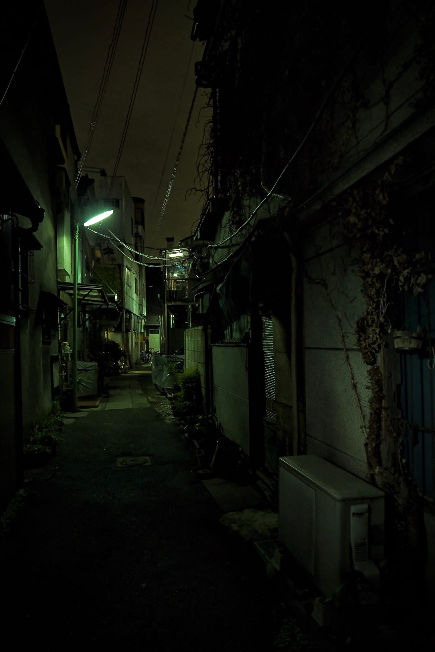 Hashimoto’s photos capture the muted or sometimes acidic colors of bicycles, overhead telephone cables, and closed shop fronts, along with the icy glow of street lamps in narrow lanes, which are often located along the tracks of commuter-train lines. In one, a shopkeeper sits at a little table at the front of her liquor store, a lone, illuminated oasis in a quiet, long-after-hours street. There, overhead lamps hang in pairs like boxy lanterns or giant, dangling Christmas-tree lights.