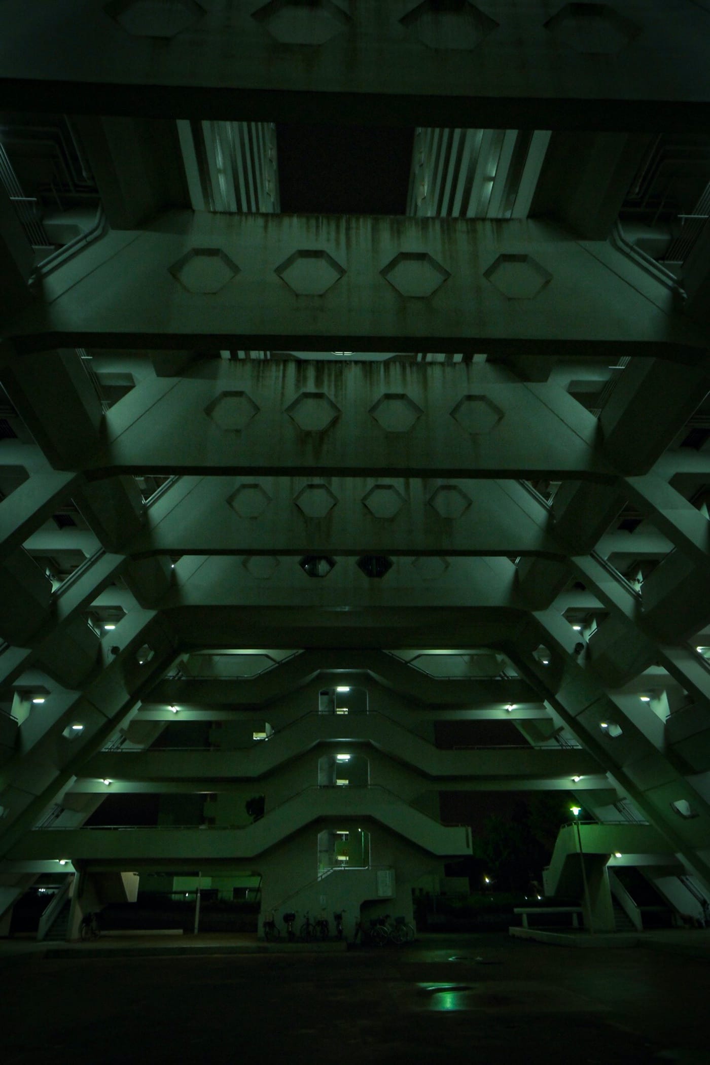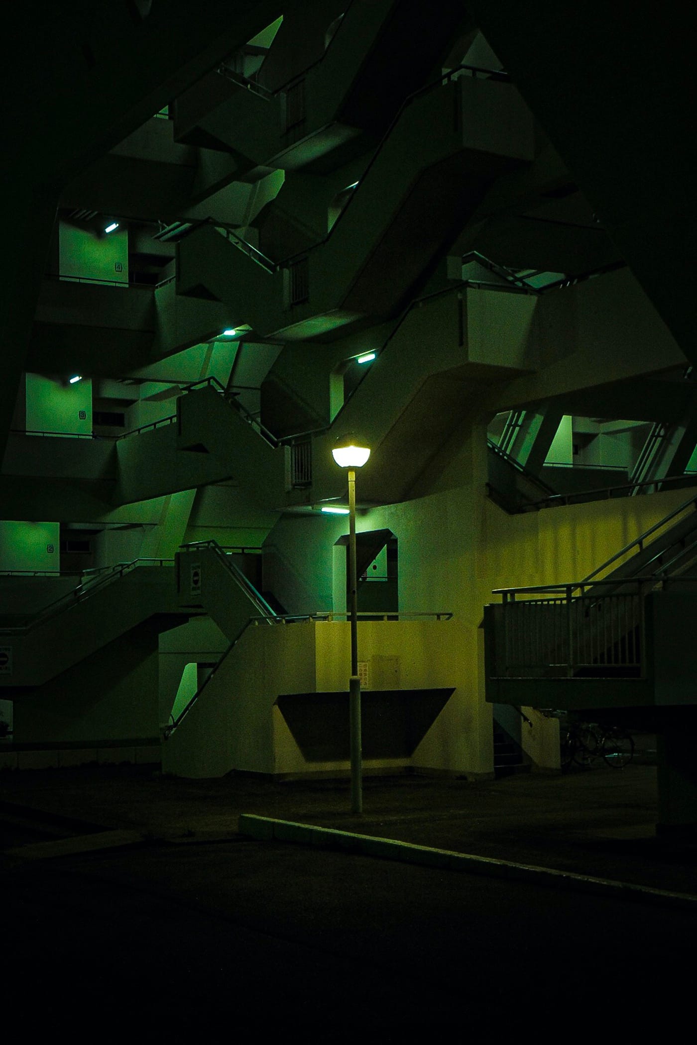 In some of her most beautifully haunting images, Hashimoto catches the otherworldly look and vibe of the Kawaramachi Housing Complex in Kawasaki, an industrial city to the south of central Tokyo. Designed by the Japanese Metabolist architect Sachio Ōtani (1924–2013) and built in the early 1970s, this enormous, concrete danchi (large-scale apartment building), with its chunky, towering, inverted-Y form, resembles some kind of futuristic Mesoamerican pyramid. In Hashimoto’s photos, ordinary street lamps and the massive structure’s security lighting accentuate its stacked and protruding building-block shapes, creating what look like abandoned sets from a sci-fi movie.