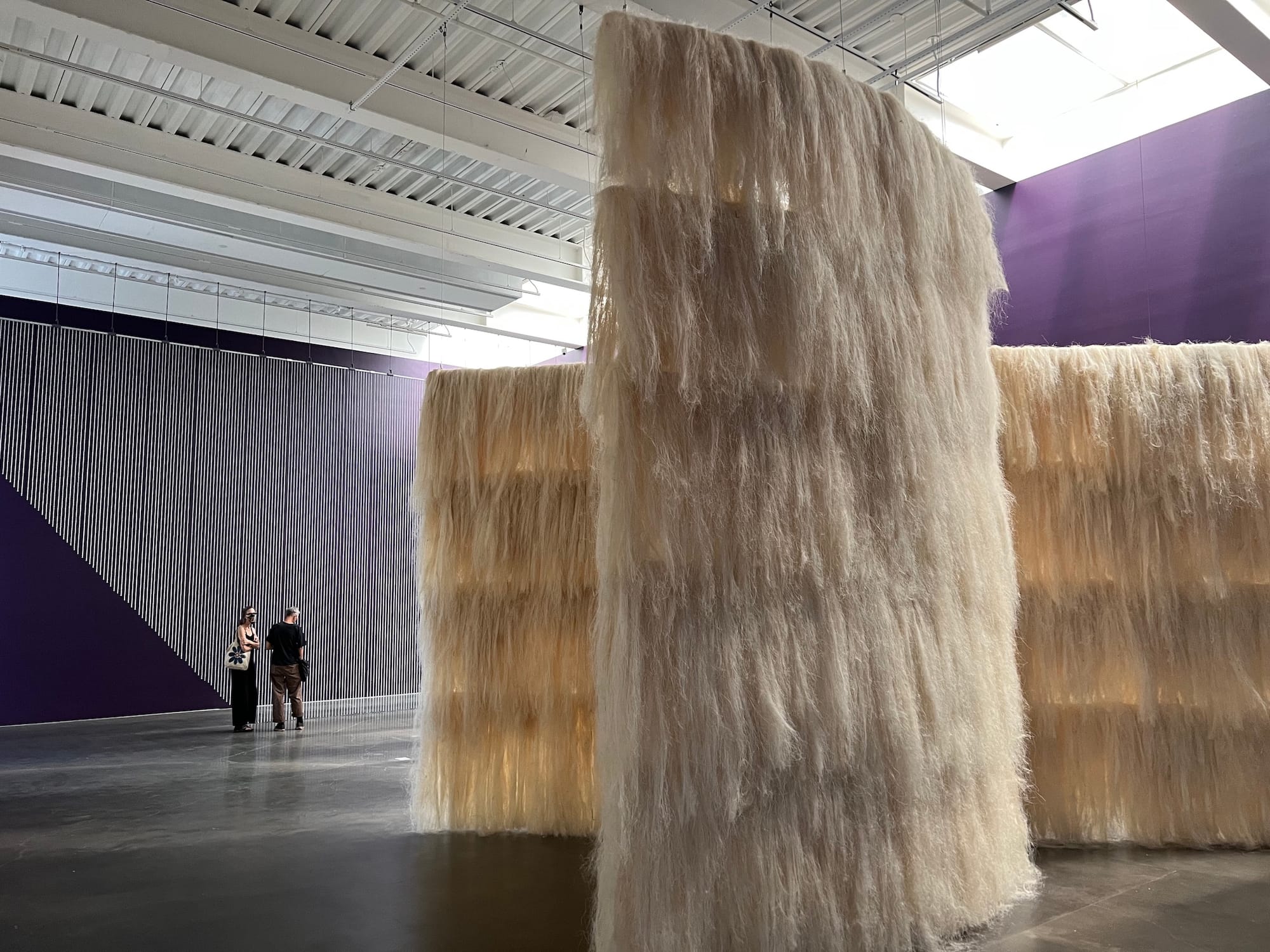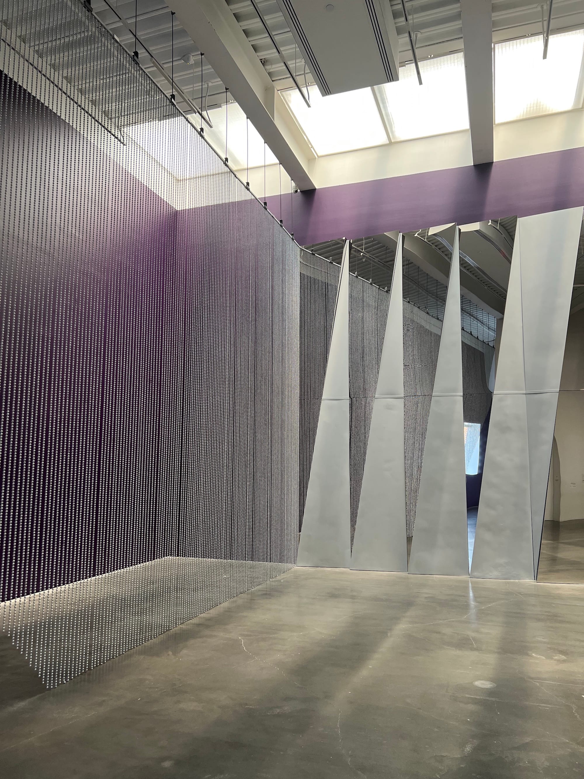 “Cloak” (2022) is a towering sculpture composed of two intersecting parts, both of which are fashioned from aluminum once used to make police floodlights. Kiwanga has seemingly emptied the floodlights of their power, having subjected them to a series of painstaking transformations: melting the aluminum down, shaping it into wires, loading it into a spray gun, and spray painting it onto steel. Though the floodlights are rendered unrecognizable by the artist's alchemy, their task of surveillance continues to loom large. One of the sculpture’s two parts consists of a beaded partition, a device that simultaneously conceals and reveals what’s on the other side; any effort to hide behind it only heightens a person’s awareness of their partial visibility. The sense of being watched is redoubled by the other part of the sculpture, where a zigzagging pattern of mirrors coaxes you to confront your own reflection. Though the sculpture is titled “Cloak,” nothing can hide underneath it.