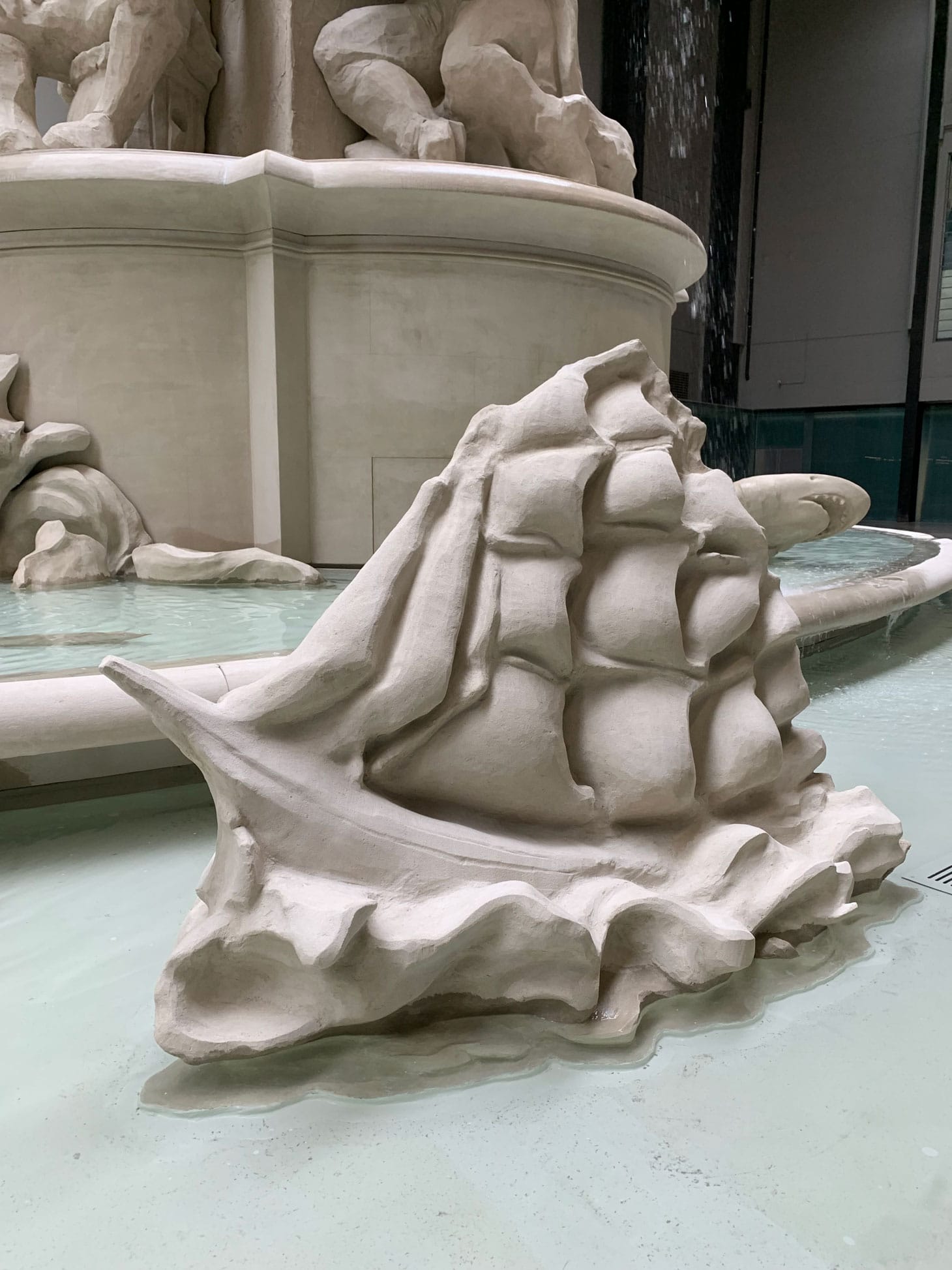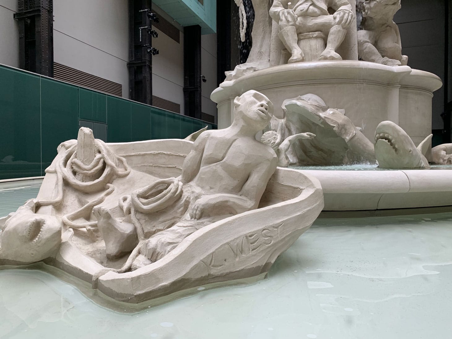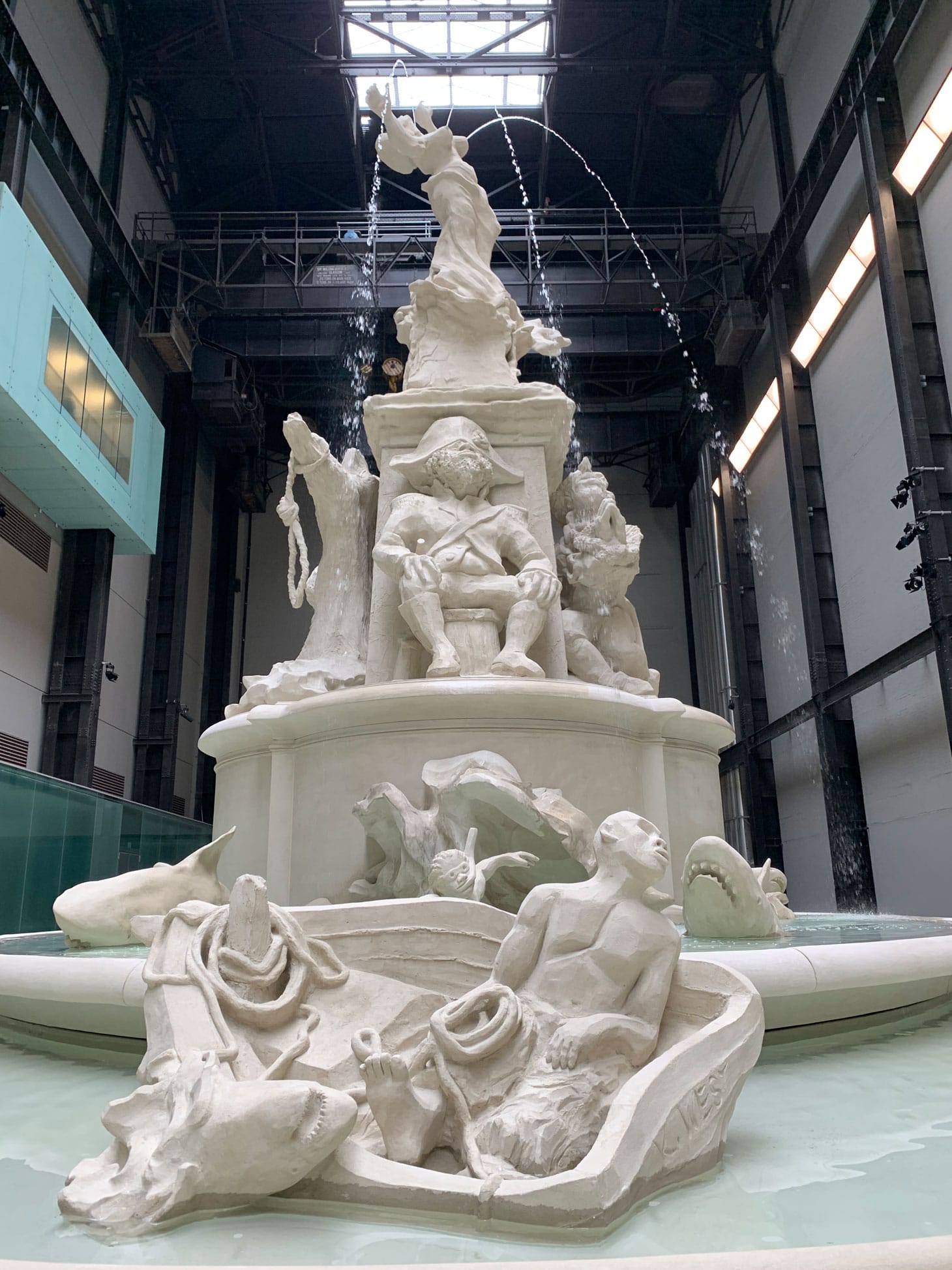 The 42-foot-high monumental sculpture is rife with allegorical references to the horror and violence of trans-Atlantic slavery, but also references other notable art-historical objects like the Trevi Fountain in Rome, Winslow Homer’s 1899 painting “The Gulf Stream,” and even Damien Hirst’s shark suspended in formaldehyde. Its initial inspiration is the Victoria Memorial in front of Buckingham Palace, a monument to 19th-century Queen Victoria.