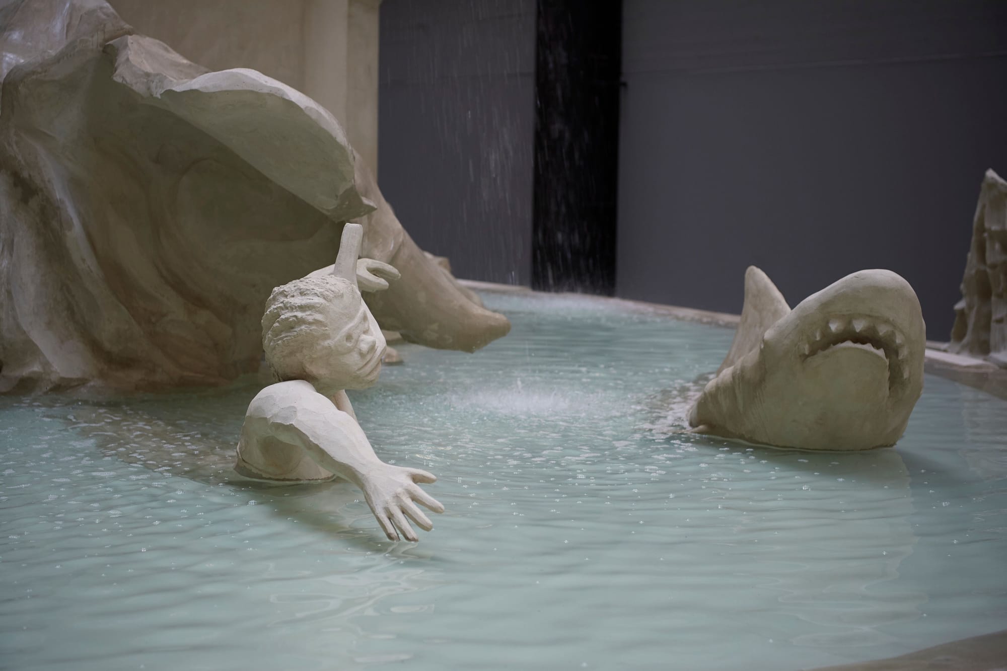 In the shallow waters of the basins, filled from on high by flamboyantly spurting streams from Venus’s breasts, sharks circle a man adrift in a boat while a desperate swimmer lunges away, and a triple-masted ship leans into the wind. We recognize an art-historical reference or two here: was this scene of a desperate man adrift and shark-pursued also in a painting called “The Gulf Stream” (1899) by Winslow Homer? And has Damien Hirst perhaps gifted these sharks?