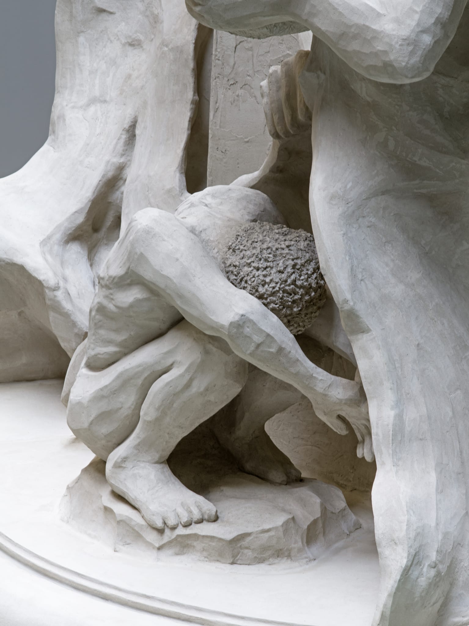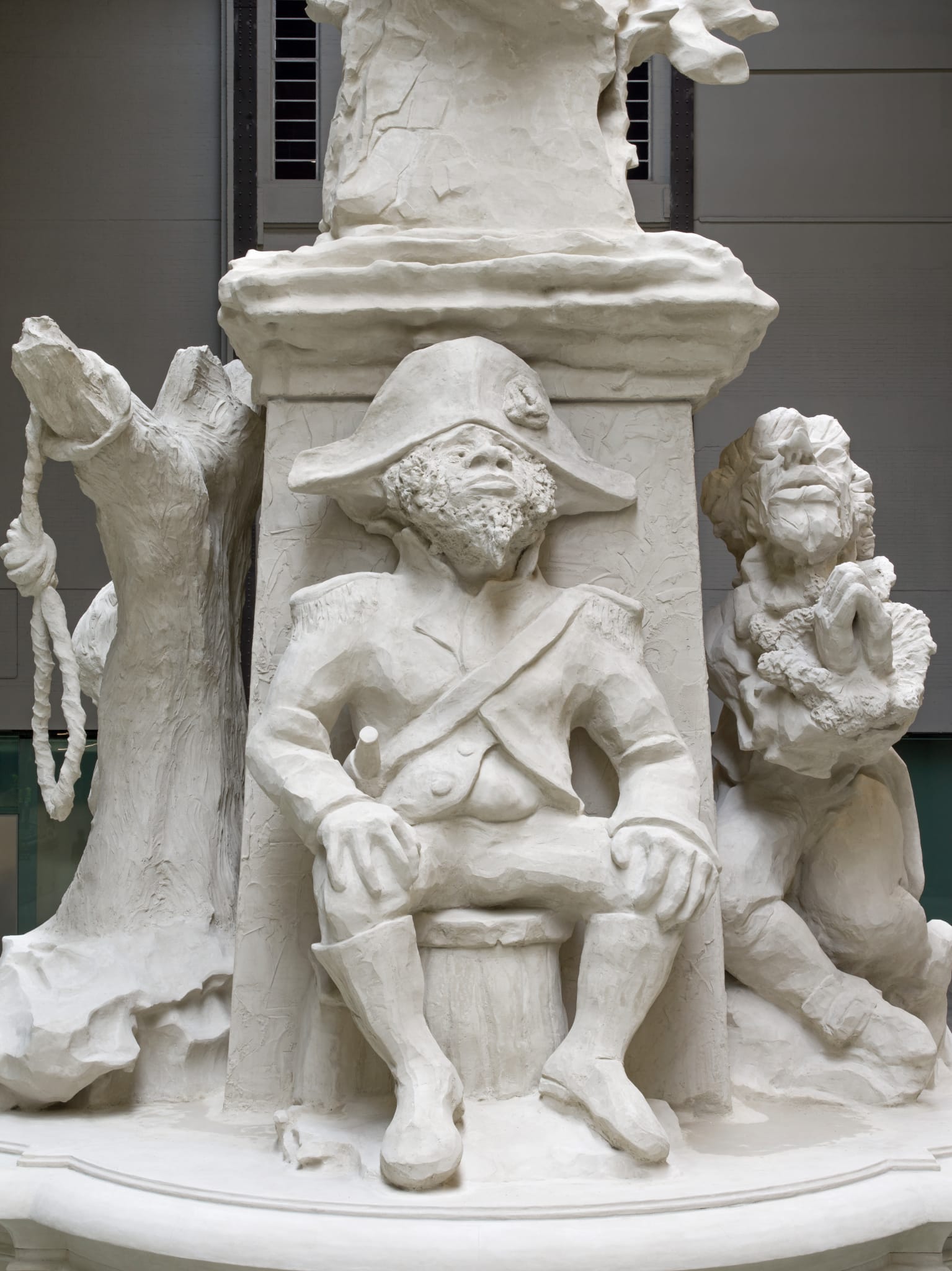 On a ledge above the oval basins, human figures posture and disport themselves. A spread-legged, bearded man who looks every inch the captain — tricorne hat, epauletted jacket — raises his eye to heaven. Toussaint L’Ouverture? Marcus Garvey? To his left a noose dangles from a blasted tree. At the other side of the ledge an uproarious, part-comic take on Queen Victoria — Queen Vicky, Kara Walker calls her — seems to be protecting an emaciated man beneath her voluminous skirts. Or is she simply unaware of the fact that he is there at all?