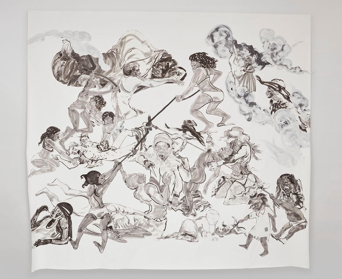 Atop Kara Walker’s large-scale drawing “The Pool Party of Sardanapalus (after Delacroix, Kienholz)” (2017), currently on view at Sikkema Jenkins, a mammy reclines; below, a group of young girls pull the entrails from a white man held down on the ground. Nearby, a hooded black male wields a shank against another black man, and a white man in a corset stabs a black male in the chest. On the outskirts of the composition, other characters are either oblivious, witnessing these acts, or simply turning away. Here, Walker adapts Delacroix’s 1827 painting, fixating on his depiction of the Assyrian king’s indifference to human life. Not dissimilar to Sardanapalus’s uncaring disposition, the work alludes to a 2015 incident in McKinney, Texas, where a white police officer, responding to a disturbance call about a neighborhood pool party, body slammed a young black girl in her bathing suit, and pulled a gun on two young boys who came to her defense. The cop, Eric Casebolt, not only used excessive force, his actions highlighted the denial of innocence to black children, who are criminalized early and often because of the color of their skin. Walker’s twisted, draconian pictures are a cypher for the present moment inasmuch as they skeptically obscure the possibility of alternative futures for our nation.