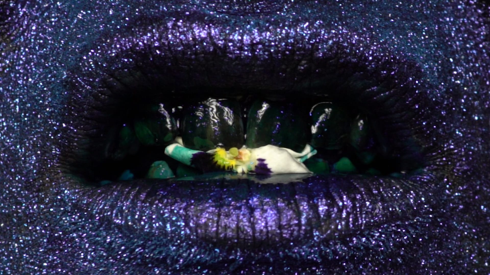 If only all artists who smothered themselves in glitter could mix the mystic and comic as well as Karen Azoulay. Often, when artists attempt to approach spiritual themes the end result is stilted. In Azoulay’s mesmerizing video art, the artist and her collaborators don gem-encrusted masks and eat flowers. There is something raw, accessible, and hypnotic about these works, making her exhibition Semi-Precious at Essex Flowers well worth the trip downtown.