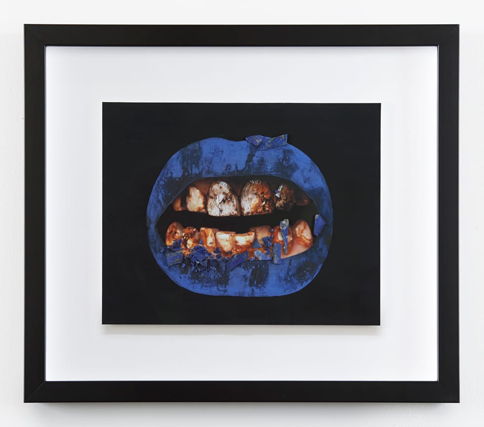 In “Lapis Lazuli with Orange Teeth” (2019), the artist creatively imagines this German nun and manuscript illuminator. Fragments of lapis lazuli coat her lips, encroaching on her teeth. Azoulay’s blue lips seem here to writhe, as if she is experiencing the power of these fragments.