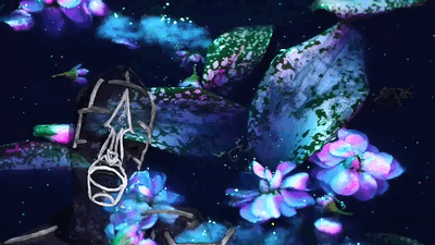 In this GIF excerpt from “Nocturne” (2018), a figure enters into a state of ecstasy amid flowers and intergalactic scenery. The point is that using stones, herbs, and flowers to access the mystic has a long and documented history among nonsecular and secular people in medieval Europe.